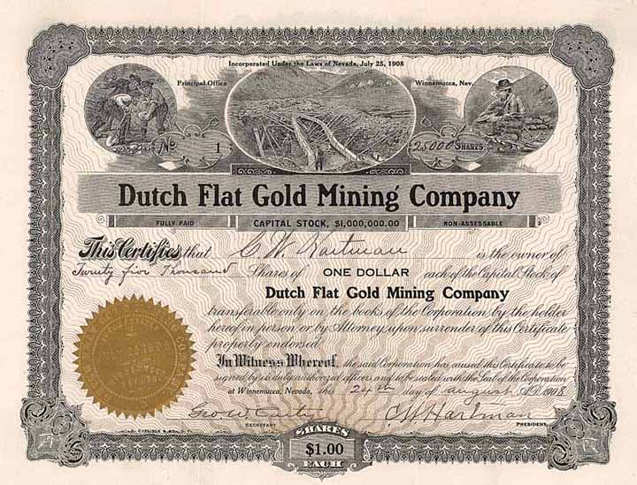 | Vorheriges Los | Zurück | Nächstes Los | | Losnr.: | 85 (Gold- und Silberminen USA) | | Titel: | Dutch Flat Gold Mining | | Auflistung: | 25000 shares à 1 $ 24.8.1908. Gründeraktie No. 1. | | Ausruf: | 80,00 EUR | Ausgabe- datum: | 24.08.1908 | Ausgabe- ort: | Winnemucca, Nevada | | Abbildung: |  | | Stücknr.: | 1 | | Info: | Die Goldmine wurde im Juli 1908 von holländischen Einwanderern gegründet. | | Besonder-heiten: | Mit drei sehr schönen runden Vignetten aus dem Bergwerksgeschehen. Ausgestellt auf und auch als president unterschrieben von C.W. Hartman. | | Verfügbar: | Verbriefte 2,5 % des gesamten Kapitals. | | Erhaltung: | Unentwertet. EF. | | Zuschlag: | offen |
