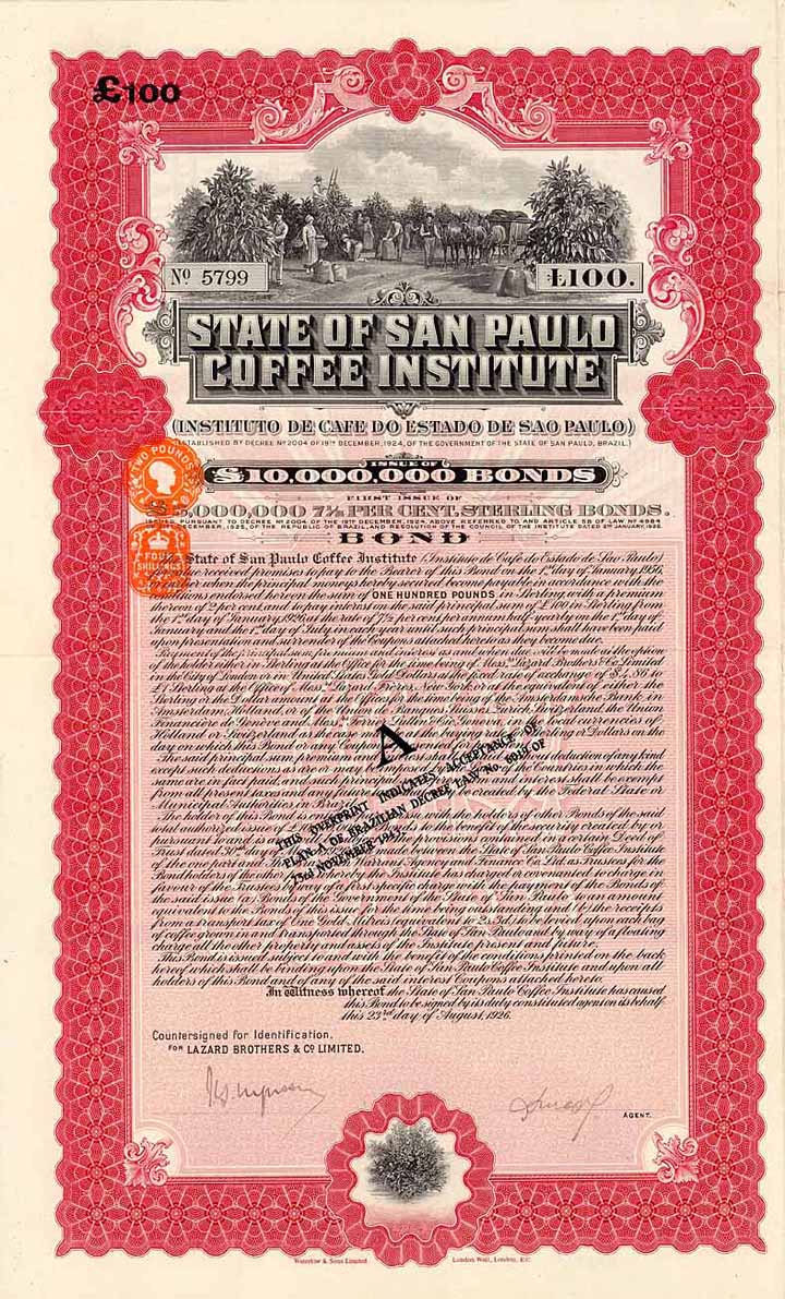 | Vorheriges Los | Zurück | Nächstes Los | | Losnr.: | 46 (Spekulationen) | | Titel: | State of San Paulo Coffee Institute (Instituto de Cafe do Estado de Sao Paulo) | | Auflistung: | 7,5 % Sterling Bond 100 £ 17.1.1927 (Auflage 29500). | | Ausruf: | 380,00 EUR | Ausgabe- datum: | 17.01.1927 | | Abbildung: |  | | Stücknr.: | 50311 | | Info: | Gründung 1924 durch den brasilianischen Bundesstaat Sao Paulo. | | Besonder-heiten: | Hochdekoratives Papier, oben große Vignette mit Ansicht einer Kaffee-Plantage, unten Abb. einer Kaffepflanze, Druck von Waterlow & Sons. | | Verfügbar: | Nicht entwertet und mit restlichen Kupons. | | Erhaltung: | VF. | | Zuschlag: | 4.400,00 EUR |