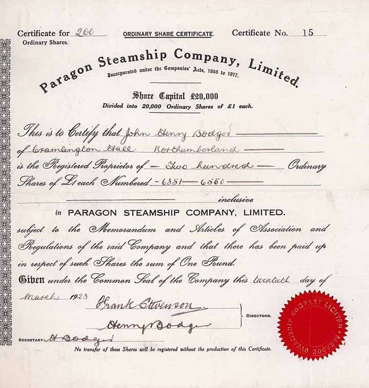 | Vorheriges Los | Zurück | Nächstes Los | | Losnr.: | 458 (Großbritannien) | | Titel: | Paragon Steamship Co. | | Auflistung: | 200 shares à 1 £ 20.3.1923. | | Ausruf: | 80,00 EUR | Ausgabe- datum: | 20.03.1923 | | Abbildung: |  | | Stücknr.: | 15 | | Info: | Reederei im Besitz der Schiffsbroker Morison, Pollexfen & Blair in Dublin. Sie betrieb den Dampfer “S.S. Paragon”. 1932 wurde die Firma liquidiert. | | Verfügbar: | Nur das eine Stück ist bekannt. | | Erhaltung: | VF+. | | Zuschlag: | offen |