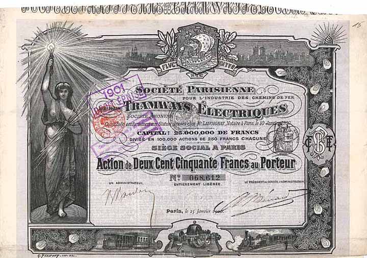 | Vorheriges Los | Zurück | Nächstes Los | | Losnr.: | 1306 (Halber Ausruf) | | Titel: | Soc. Parisienne pour L’Industrie des C.d.F. Tramways Électriques S.A. | | Auflistung: | Action 250 Frs. 25.1.1900. Gründeraktie (Auflage 100000). | | Ausruf: | 35,00 EUR | Ausgabe- datum: | 25.01.1900 | Ausgabe- ort: | Paris | | Abbildung: |  | | Stücknr.: | 68612 | | Info: | Eine Gründung (1900) von dem belgischen Ingenieur und Finanzier Baron Édouard Louis Joseph Empain (1852-1929), der mehrere Straßenbahnen in Belgien und Frankreich bauen ließ. Noch heute bestehendes Unternehmen, welches sich kurz SPIE nennt. | | Besonder-heiten: | Hochdekorativ mit Allegorie, Stadansichten, Straßen- und Eisenbahn in der schmuckvollen Umrandung. Die Aktie wurde von dem Künstler Gustave Fraipont entworfen (Signatur in der Platte). | | Verfügbar: | Mit anh. Kupons. | | Erhaltung: | VF+. | | Zuschlag: | 44,00 EUR |