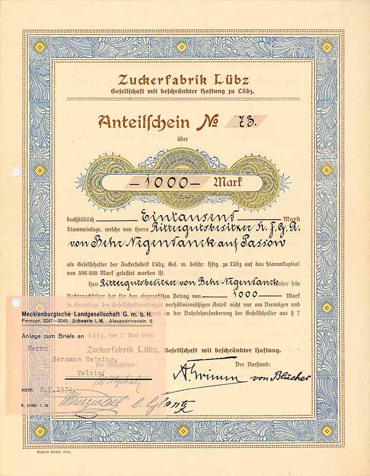 | Vorheriges Los | Zurück | Nächstes Los | | Losnr.: | 1751 (Deutschland bis 1945 (Nicht Reichsbank)) | | Titel: | Zuckerfabrik Lübz GmbH | | Auflistung: | Namens-Anteilschein 1.000 Mark 7.5.1910. Gründerstück (R 10). | | Ausruf: | 500,00 EUR | Ausgabe- datum: | 07.05.1910 | Ausgabe- ort: | Lübz | | Abbildung: |  | | Stücknr.: | 52 | | Info: | Errichtet 1894 durch die Hallesche Maschinen-Fabrik. Gegründet 1910 mit einem Stammkapital von 596.500 Mark. Errichtung und Betrieb einer Fabrik zur Herstellung von Zucker aus Zuckerrüben. | | Besonder-heiten: | Dekoratives Papier mit verspielter Zierumrandung, mehrfarbig gestaltet. | | Verfügbar: | Abheftlochung. Inwendig Übertragungen bis 1934. Überhaupt nur 4 unentwertete Stücke (+ 1 gelochtes RB-Stück) bekannt. (R 10) | | Erhaltung: | EF-VF. | | Zuschlag: | 800,00 EUR |