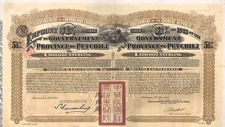 | Vorheriges Los | Zurück | Nächstes Los | | Losnr.: | 37 (Spekulationen) | | Titel: | Government of the Province of Petchili | | Auflistung: | 5,5 % Gold Bond 20 £ 4.4.1913. | | Ausruf: | 5.000,00 EUR | Ausgabe- datum: | 04.04.1913 | Ausgabe- ort: | Antwerpen | | Abbildung: |  | | Stücknr.: | 21117 | | Besonder-heiten: | Teil einer Anleihe von 500.000 £ für öffentliche Arbeiten, die in Brüssel und Antwerpen platziert wurde. Abgesichert durch Wein- und Tabaksteuern der Provinz und eine zusätzliche Garantie der Zentralregierung, trotzdem bereits seit 1926 in default und komplett unbezahlt. Zweisprachig englisch/französisch. Dekoratives Großformat, Vignette mit Dschunke vor Vulkanen. | | Verfügbar: | Unentwertet, mit Kupons No. 27 - 80. | | Erhaltung: | EF. | | Zuschlag: | 7.500,00 EUR |