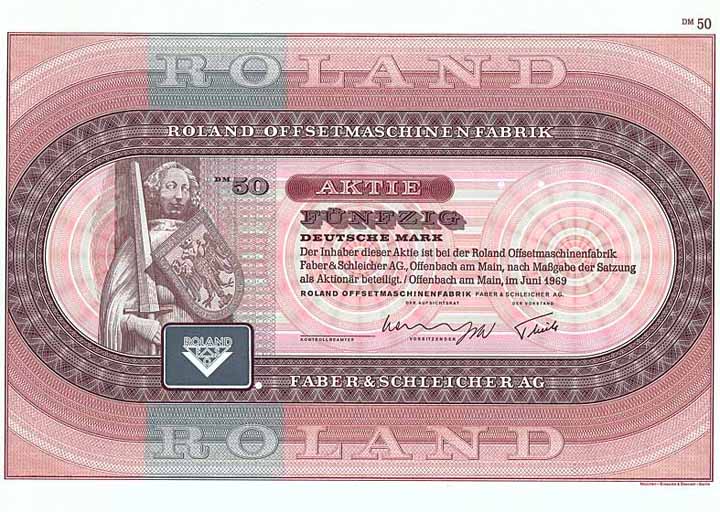 | Vorheriges Los | Zurück | Nächstes Los | | Losnr.: | 2201 (Deutschland 1948-2000 (Die Deutsche Mark)) | | Titel: | Roland Offsetmaschinenfabrik Faber & Schleicher AG | | Auflistung: | Aktie 50 DM Juni 1969 (Muster, R 10). | | Ausruf: | 200,00 EUR | Ausgabe- datum: | 01.06.1969 | Ausgabe- ort: | Offenbach a.M. | | Abbildung: |  | | Info: | Gründung 1871 als “Associationsgeschäft zur Produktion von lithographischen Schnellpressen” durch Louis Faber und Adolf Schleicher. AG seit 1897 als “Faber & Schleicher Maschinenfabrik auf Actien”. Zunächst Bau von Steindruck-Schnellpressen, 1911 kommt die erste ROLAND-Offsetpresse auf den Markt. 1957 Umfirmierung wie oben. 1979 Vereinigung mit dem Druckmaschinenbereich der M.A.N. und Umfirmierung in "MAN Roland Druckmaschinen AG". Heute weltweit zweitgrößter Hersteller von Druckmaschinen und Weltmarktführer im Rollenoffset, beschäftigt werden 8.700 Mitarbeiter in den Werken Augsburg, Offenbach, Plauen und Mainhausen. 2005/06 squeeze-out der Kleinaktionäre der bis dahin börsennotierten AG, später verkauft MAN die Mehrheit an den Investor “Allianz Capital Partners GmbH”. | | Besonder-heiten: | Mit großer Abb. des Roland. | | Verfügbar: | Bislang nicht katalogisierte Emission. Mit Kupons. (R 10) | | Erhaltung: | UNC-EF. | | Zuschlag: | 370,00 EUR |