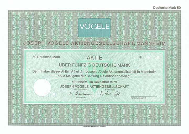 | Vorheriges Los | Zurück | Nächstes Los | | Losnr.: | 2073 (Deutschland ab 1948 (Die Deutsche Mark)) | | Titel: | Joseph Vögele AG | | Auflistung: | Aktie 50 DM Dez. 1979 (Muster, R 10). | | Ausruf: | 75,00 EUR | Ausgabe- datum: | 01.12.1979 | Ausgabe- ort: | Mannheim | | Abbildung: |  | | Info: | Das Unternehmen wurde 1836 von dem Schmied Joseph Vögele in Mannheim gegründet. Es etablierte sich als Zulieferer für die Eisenbahn. Zusammen mit dem Schienennetz (1835 fuhr die erste deutsche Eisenbahn von Nürnburg nach Fürth) wuchs das Unternehmen und lieferte Weichen, Schiebebühnen, Drehscheiben und Rangieranlagen. 1920 in eine AG umgewandelt. 1925 begann man den Schwerpunkt zum Straßenbau zu verlagern. Es wurden die ersten Betoneinbauzüge, Bodenvermörtler und Aspahltdeckenfertiger konstruiert. Heute international tätiges Straßenfertigungsunternehmen. 1996 übernahm die Wirtgen Group die Mehrheit, die letzten Aktionäre wurden 2002 in einem Squeeze-out abgefunden. | | Verfügbar: | Bislang nicht katalogisiert. Muster-perforiert. (R 10) | | Erhaltung: | UNC-EF. | | Zuschlag: | 75,00 EUR |