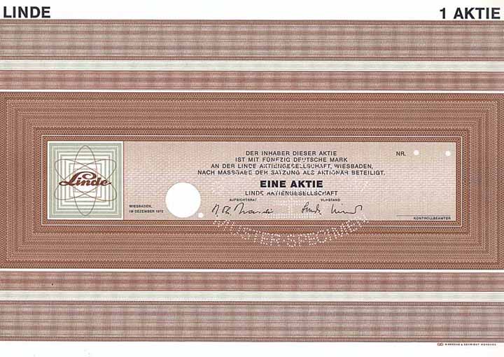 | Vorheriges Los | Zurück | Nächstes Los | | Losnr.: | 2090 (Deutschland ab 1948 (Die Deutsche Mark)) | | Titel: | Linde AG | | Auflistung: | Aktie 50 DM Dez. 1972 (Muster, R 10). | | Ausruf: | 120,00 EUR | Ausgabe- datum: | 01.12.1972 | Ausgabe- ort: | Wiesbaden | | Abbildung: |  | | Info: | Gegründet 1879 als ältestes Unternehmen der Welt auf dem Gebiet der Kältetechnik (Kälteerzeugung und -verwendung), Gasverflüssigung und -zerlegung zwecks Verwertung der Lindes'schen Patente und Verfahren. 1965 Änderung des Firmennamens von “Gesellschaft für Linde’s Eismaschinen AG” in “Linde AG”. Heute mit über 40.000 Beschäftigten in den Arbeitsgebieten Anlagenbau, Fördertechnik (der Gabelstaplerbereich wurde vor kurzem in die KION ausgegliedert), Kältetechnik und technische Gase einer der 30 großen DAX-Werte. | | Verfügbar: | R 10 | | Erhaltung: | UNC-EF. | | Zuschlag: | 150,00 EUR |