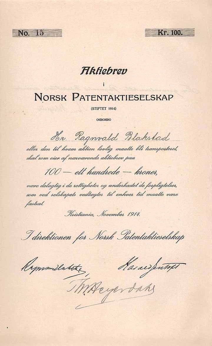 | Vorheriges Los | Zurück | Nächstes Los | | Losnr.: | 773 (Norwegen) | | Titel: | Norsk Patentaktieselskap | | Auflistung: | Aktie 100 nkr Nov. 1914. Gründeraktie. | | Ausruf: | 60,00 EUR | Ausgabe- datum: | 01.11.1914 | Ausgabe- ort: | Kristiania | | Abbildung: |  | | Stücknr.: | 15 | | Info: | Gegründet 1914. | | Besonder-heiten: | Ausgestellt auf Hr. Ragnvald Blakstad. Originalunterschriften. | | Verfügbar: | Doppelblatt. | | Erhaltung: | EF-VF. | | Zuschlag: | offen |