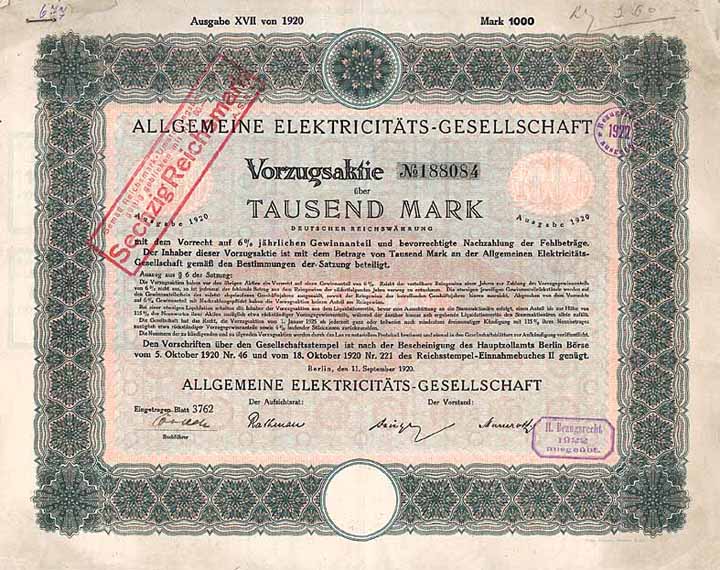 | Vorheriges Los | Zurück | Nächstes Los | | Losnr.: | 1068 (Deutschland bis 1945 (Nicht Reichsbank)) | | Titel: | Allgemeine Elektricitäts-Gesellschaft | | Auflistung: | VZ-Aktie Ausg. XVII 1.000 Mark 11.9.1920 (Auflage 25000, R 10). | | Ausruf: | 180,00 EUR | Ausgabe- datum: | 11.09.1920 | Ausgabe- ort: | Berlin | | Abbildung: |  | | Stücknr.: | 188084 | | Info: | Gründung 1883 durch Emil Rathenau als "Deutsche Edison-Gesellschaft für angewandte Elektricität", 1887 Umfirmierung in AEG. Beim Besuch der Weltausstellung in Philadelphia lernte Emil Rathenau die epochemachenden Erfindungen von Thomas A. Edison kennen. Es gelang ihm, die Patente für Deutschland zu erwerben. Zu Recht wird Rathenau als der Begründer der elektrischen Großindustrie in Deutschland bezeichnet. Was mit der Herstellung von Glühlampen begann, entwickelte sich bald zu einem Unternehmen, das auf allen Gebieten der Elektrotechnik eine führende Rolle spielte - lange blieb der Wettstreit mit Siemens & Halske um den ersten Platz unentschieden. Der Niedergang nach dem 2. Weltkrieg mündete schließlich 1985 in der Mehrheitsübernahme durch den Daimler-Benz-Konzern, der unter dem Vorstandsvorsitzenden Edzard Reuter (Sohn des legendären Berliner Nachkriegs-OB) vom Aufbau eines umfassenden Technologiekonzerns als Welt-AG träumte. Als auch dieser Traum ausgeträumt war, löste Daimler-Benz (nun unter Reuters Nachfolger Jürgen Schrempp) die AEG 1996 auf. | | Besonder-heiten: | Faksimile-Unterschrift Rathenau als AR-Vorsitzender. | | Verfügbar: | Nicht aus der Reichsbank stammend (aus der nur 3 Stücke bekannt sind). Mit angeklammerten Restkupons. (R 10) | | Erhaltung: | VF. | | Zuschlag: | 180,00 EUR |