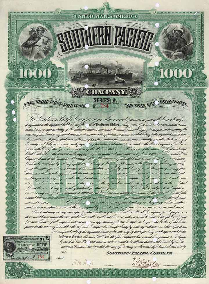 | Vorheriges Los | Zurück | Nächstes Los | | Losnr.: | 264 (U.S.A.) | | Titel: | Southern Pacific Co. | | Auflistung: | 6 % Gold Bond 1.000 $ 1.1.1891. | | Ausruf: | 290,00 EUR | Ausgabe- datum: | 01.01.1891 | Ausgabe- ort: | New York | | Abbildung: |  | | Stücknr.: | 784 | | Info: | Eine der größten Eisenbahn- und Dampfschifffahrtsunternehmungen der Vereinigten Staaten. Gegründet 1884 durch Spezialgesetz des Staates Kentucky zur Pachtung der Strecken der Southern Pacific RR und der Central Pacific Ry. im Rahmen des sog. “Omnibus Lease”. Unter Einschluß einer ganzen Zahl hinzuerworbener Bahnen besaß die SP nach der Jahrhundertwende ein Netz von fast 10.000 Meilen Streckenlänge! Es startete im Osten in New Orleans (mit weitreichenden Verästelungen in Texas), dann führte die Hauptstrecke über El Paso, Phoeniz, Az. und Yuma nach Los Angeles, von wo aus gleich drei Hauptbahnen an der Küste und im Hinterland mit unzähligen Verzweigungen nach San Francisco führten. Von San Francisco aus gab es dann zwei weitere bedeutende Hauptstrecken: Eine zurück über die Rocky Mountains nach Osten bis Salt Lake City in Utah, die andere nach Norden bis Portland in Oregon. | | Besonder-heiten: | Schöner grün/schwarzer ABNC-Stahlstich mit drei Vignetten: Handwerksbursche auf Wanderschaft, Schiffe im Hafen, Seemann auf Ausguck. | | Erhaltung: | EF-VF. | | Zuschlag: | offen |