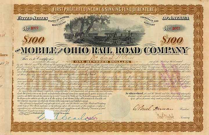 | Vorheriges Los | Zurück | Nächstes Los | | Losnr.: | 97 (U.S.A.) | | Titel: | Mobile & Ohio Railroad | | Auflistung: | First pref. Debenture 100 $ 1.5.1879. | | Ausruf: | 75,00 EUR | Ausgabe- datum: | 01.05.1879 | | Abbildung: |  | | Stücknr.: | 977 | | Info: | Konzessioniert 1848. Die am 20.9.1850 vom Kongreß beschlossenen Landschenkungen in Alabama, Mississippi und Kentucky an die Mobile & Ohio waren die ersten auf dem amerikanischen Kontinent überhaupt! Eröffnet wurde die 472 Meilen lange Hauptstrecke Mobile, Ala. nach Columbus, Ky. (übrigens eine reine Güterbahn) im Jahr 1861. Über 100 Lokomotiven und über 4.000 Waggons verkehrten hier um die Jahrhundertwende. Die M&O ging schließlich in der mächtigen Southern Railway auf. | | Besonder-heiten: | Schöner Stahlstich der ABNC mit Eisenbahn, Mississippidampfer, Rindviechern. | | Verfügbar: | Ausschnittentwertet. | | Erhaltung: | VF. | | Zuschlag: | offen |