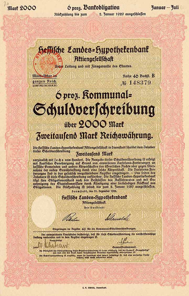| Vorheriges Los | Zurück | Nächstes Los | | Losnr.: | 1035 (Deutschland bis 1945 (Nicht Reichsbank)) | | Titel: | Hessische Landes-Hypothekenbank AG | | Auflistung: | 6 % Kommunal-Schuldv. 2.000 Mark 31.12.1922 (R 10). | | Ausruf: | 80,00 EUR | Ausgabe- datum: | 31.12.1922 | Ausgabe- ort: | Darmstadt | | Abbildung: |  | | Stücknr.: | 148379 | | Info: | Gründung 1903 als gemeinnütziges Unternehmen durch den Hessischen Staat, die Spar- und Leihkasse des Kreises Bingen, die Spar- und Leihkasse zu Oppenheim, die Stadt Worms und die Provinz Oberhessen. Nach turbulenten Krisen in den 70er Jahren heute die Landesbank mit dem zweitbesten Rating. | | Verfügbar: | Aus einer alten Sammlung. (R 10) | | Erhaltung: | EF. | | Zuschlag: | 80,00 EUR |