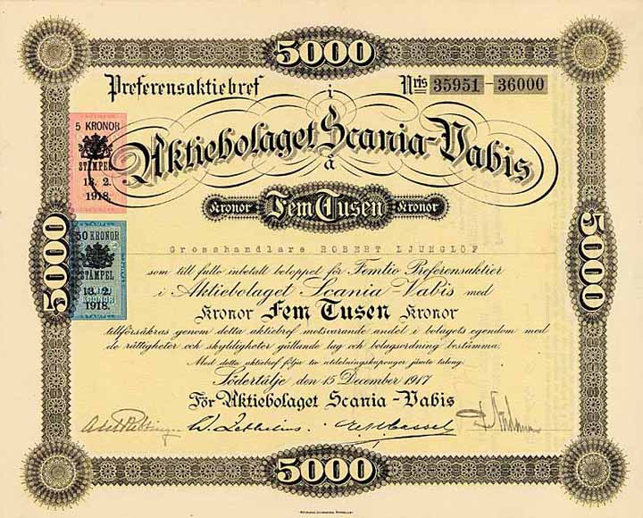 | Vorheriges Los | Zurück | Nächstes Los | | Losnr.: | 443 (Schweden) | | Titel: | AB Scania-Vabis | | Auflistung: | Pref.-Aktie 50 x 100 skr 15.12.1917. | | Ausruf: | 150,00 EUR | Ausgabe- datum: | 15.12.1917 | Ausgabe- ort: | Södertälje | | Abbildung: |  | | Stücknr.: | 35951-36000 | | Info: | Die Maskinfabriks AB Skania wurde 1891 in Malmö gegründet und produzierte zunächst Fahrräder. 1902 verließ die erste Serie von 6 Automobilen (mit deutschen 2-Zylinder-Motoren von Kämper) die Fabrik, und die Fahrt über Land 1903 zur Stockholmer Automobil-Ausstellung geriet zur Sensation. 1911 fusionierte Scania mit Vabis (Vagnfabriks-AB i Södertälje), einer Tochter der Waggonfabrik Surahammars Bruk, die schon 1897 versuchsweise mit dem Automobilbau begonnen hatte. Seit der Fusion konzentrierte sich die Firma nur noch auf Nutzfahrzeuge und ist heute der profitabelste LKW-Hersteller Europas mit 28.000 Beschäftigten in über 100 Ländern und 11 Fabriken. Seit 1996 in Stockholm und New York börsennotiert, Großaktionär VOLVO scheiterte mit einer Übernahme an den Wettbewerbshütern und sucht nun einen neuen Partner (neben dem zweiten Großaktionär Volkswagen ist auch immer wieder MAN im Gespräch). | | Verfügbar: | Mit Kupons. Äußerst selten. | | Erhaltung: | EF. | | Zuschlag: | offen |