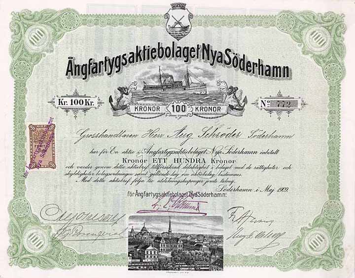 | Vorheriges Los | Zurück | Nächstes Los | | Losnr.: | 454 (Schweden) | | Titel: | Ångfartygsaktiebolaget Nya Söderhamn | | Auflistung: | Aktie 100 skr Mai 1909. Gründeraktie. | | Ausruf: | 75,00 EUR | Ausgabe- datum: | 01.05.1909 | Ausgabe- ort: | Söderhamn | | Abbildung: |  | | Stücknr.: | 913 | | Info: | Gründung der Reederei im Mai 1909. | | Besonder-heiten: | Hochdekorativ gestaltetes Papier: oben Vignette mit Ansicht des firmeneigenen Dampfers, unten Ansicht der Stadt Söderhamn. Mehrere Originalsignaturen. Inwendig abgedruckte Firmenstatuten. | | Verfügbar: | Mit Restkupons. | | Erhaltung: | EF. | | Zuschlag: | 75,00 EUR |