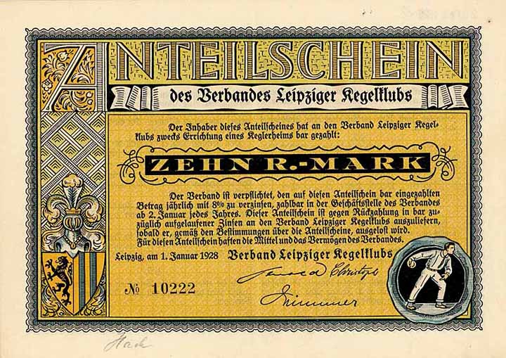 | Vorheriges Los | Zurück | Nächstes Los | | Losnr.: | 1635 (Deutschland bis 1945 (Nicht Reichsbank)) | | Titel: | Verband Leipziger Kegelklubs | | Auflistung: | 8 % Anteilschein 10 RM 1.1.1928 (Auflage 5000, R 10). | | Ausruf: | 200,00 EUR | Ausgabe- datum: | 01.01.1928 | Ausgabe- ort: | Leipzig | | Abbildung: |  | | Stücknr.: | 10222 | | Info: | 1927 beschloß die Hauptversammlung des Verbandes die Aufnahme einer Anleihe von 300.000 RM zur Errichtung eines Keglerheims. | | Besonder-heiten: | Ausgesprochen dekorative mehrfarbige Gestaltung mit Leipziger Stadtwappen une einem Kegelbruder beim Kegeln. | | Verfügbar: | Bislang völlig unbekannt gewesen, Einzelstück aus einer sehr alten Sammlung. (R 10) | | Erhaltung: | EF. | | Zuschlag: | 200,00 EUR |