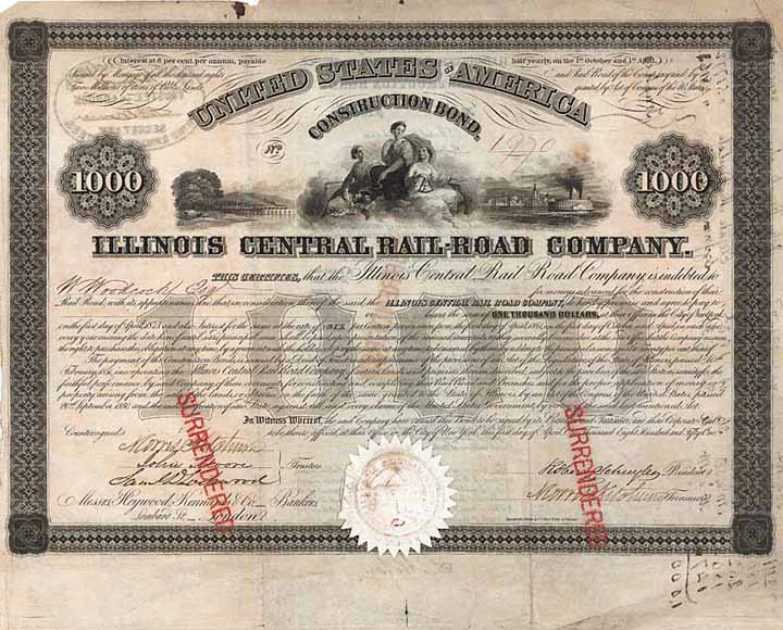 | Vorheriges Los | Zurück | Nächstes Los | | Losnr.: | 84 (U.S.A.) | | Titel: | Illinois Central Railroad | | Auflistung: | 6 % Construction Bond 1.000 $ 1.4.1851. | | Ausruf: | 120,00 EUR | Ausgabe- datum: | 01.04.1851 | Ausgabe- ort: | New York | | Abbildung: |  | | Stücknr.: | 1879 | | Info: | Konzessioniert 1850. Die Gesellschaft erhielt vom Kongress umfangreiche Landschenkungen unter der Bedingungen, dass die über 700 Meilen lange Strecke binnen 6 Jahre fertigzustellen war - das gelang auch. Bis zur Jahrhundertwende wuchs das Streckennetz auf fast 2.000 Meilen mit den Hauptlinien Centralia, Ill. nach Dubuque, Iowa (340 Meilen), Chicago-Cairo, Ill. (364 Meilen) und weiter von Cairo nach New Orleans (548 Meilen). | | Besonder-heiten: | Hochdekorative Gestaltung mit drei weiblichen Allegorien, links davor Eisenbahn auf Brücke, rechts ein Flußdampfer. Originalunterschriften von Robert Schuyler (als Präsident) und Morris Ketchum Jesup (2x, als Trustee und als Treasurer). Robert Schuyler war erster Präsident der Illinois Central RR, einer der größten amerikanischen Nord-Süd-Eisenbahnen. Schuyler wird als der erste große US-Railroad-King angesehen. Morris Ketchum Jesup (1830-1908) kam 1837 nach dem frühen Tod seines Vaters nach New York, besuchte einige Privatschulen und begann seine berufliche Laufbahn schon mit 12 Jahren im Büro der Rogers Locomotive Works. Mit dieser Erfahrung startete er 1854 ein Zulieferergeschäft für Eisenbahnen, anschließend machte er als Bankier ein Vermögen. 1899-1907 war er Präsident der Handelskammer des Staates New York, einer der Gründer und Hauptsponsoren des American Museum of Natural History, schließlich auch Präsident des Peary Arctic Club (Entdecker des Nordpols). | | Erhaltung: | VF. | | Zuschlag: | 120,00 EUR |