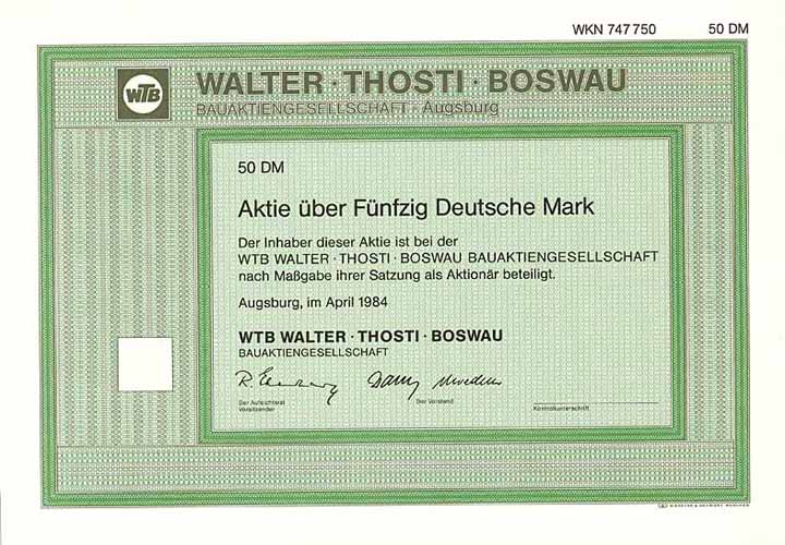 | Vorheriges Los | Zurück | Nächstes Los | | Losnr.: | 1897 (Deutschland ab 1948 (Die Deutsche Mark)) | | Titel: | WTB Walter Thosti Boswau Bau-AG | | Auflistung: | Aktie 50 DM April 1984 (Blankette, R 9). | | Ausruf: | 100,00 EUR | Ausgabe- datum: | 01.04.1984 | Ausgabe- ort: | Augsburg | | Abbildung: |  | | Info: | 1876 gründen in Augsburg der Bauingenieur Alfred Thormann und der Maurermeister Tobias Schneller ein Baugeschäft für Industrie- und Wasserbauten. 1880 beteiligt sich auch der Ingenieur Jean Stiefel und setzt sich besonders für den damals neuen Baustoff Beton ein. 1883 wird eine eigene Fabrik für Betonrohre und Werksteine errichtet. 1890 baut Thosti für die Mechanische Baumwollspinnerei und Weberei Augsburg (SWA) als Werk III „Proviantbach“ das als eines der bedeutendsten bayerischen Industriedenkmäler bis heute erhaltene „Fabrikschloß“. 1895 übernimmt Jean Stiefel nach dem Tod von Thormann und Schneller die alleinige Firmenleitung. 1898 gehört er zu den Mitgründern des Deutschen Betonvereins. 1902 Abschluß eines Lizenzvertrages mit Hennebique zur Ausführung von Eisenbetonbauten, Thosti ist Pionier im süddeutschen Eisenbetonbau. In der neuen Bauweise entsteht 1910 als Werk IV „Aumühle“ ebenfalls für die SWA der „Glaspalast“, heute kulturelle Nutzung u.a. durch das Kunstmuseum Walter. Als 1907 auch Stiefel stirbt, führen die beiden Witwen Sofie Thormann und Johanna Stiefel die Firma bis zum und durch den 1. Weltkrieg, ehe sie 1917 in eine AG umgewandelt wird. Für die Einbringung der meisten Aktiva von Thormann & Stiefel erhalten die beiden Witwen 70 % der Aktien, die Führung übernehmen erstmals familienfremde Manager. Ab 1922 nimmt das Geschäft durch Ausführung von Fabrikneubauten für die Augsburger Textil- und Papierindustrie sowie von Wasserkraftanlagen an Lech und Iller weiteren großen Aufschwung. Nach der Weltwirtschaftkrise bringen die Arbeitsbeschaffungsmaßnahmen der Reichsregierung viele Aufträge im Straßen-, Autobahn- und Brückenbau. 1937 Gründung der Niederlassung Nürnberg, die Beschäftigtenzahl steigt auf über 2.000. Neubeginn 1945 mit der Baustoffherstellung aus Trümmerschutt, 1946 Gründung der Niederlassung München, 1947 erste Anwendung der Spannbetonbauweise für eine Brücke. Bis Mitte der 1970er Jahre steigt die Beschäftigtenzahl auf über 4.000, Planung und schlüsselfertige Projekterstellung werden der Normalfall, deutliche Ausweitung der Auslandsaktivitäten. Die 1971 erworbene Beteiligung von 25 % an der Hamburger Lenz-Bau AG muß nach deren Konkurs 1976 abgeschrieben werden. 1978 übernimmt der 1936 in Augsburg geborene Unternehmer Ignaz Walter die Aktienmehrheit der gerade in THOSTI Bauaktiengesellschaft umfirmierten AG. 1983 anläßlich der Übernahme der seit 1892 bestehenden Düsseldorfer Boswau & Knauer AG (zu der Zeit vor allem als Spezialist für Bunkeranlagen bekannt, von denen auch im Irak eine Anzahl errichtet wurden) Umfirmierung in WTB Walter-Thosti-Boswau AG. 1988 Übernahme der Münchener Heilit + Woerner Bau AG. 1991 Erwerb der Aktienmehrheit an der Stuttgarter Züblin AG und erneute Umfirmierung in WALTER-BAU AG. Via Züblin wird 1992 auch noch der Konkurrent Dywidag übernommen (der zuvor 1991 mit der UNION-BAU AG die größte ostdeutsche Baufirma übernommen hatte, vor der Wende VEB BMK Kohle und Energie). Mit ca. 10.000 Beschäftigten ist Walter-Bau nach der Hochtief AG nun der zweitgrößte deutsche Baukonzern. Aktionäre sind jetzt neben der Familie Walter (47 %) einige Schweizer Banken (30 %) und die Bayerische Landesbank (14 %). Als in Deutschland der Wiedervereinigungs-Bauboom abklingt, gerät die Firma in große Schwierigkeiten. Die Kündigung der Avalkreditlinien durch die Deutsche Bank besiegelt Anfang 2005 ihr Schicksal: Neben der Konzernmutter stellen auch 11 Tochterfirmen Insolvenzantrag. Die wirtschaftlich erhaltenswerten Teile werden im April 2005 in der DYWIDAG Holding GmbH gebündelt und an die österreichische STRABAG SE verkauft. | | Verfügbar: | Nur 10 Blanketten wurden im Walter-Bau-Archiv gefunden. (R 9) | | Erhaltung: | UNC. | | Zuschlag: | 120,00 EUR |