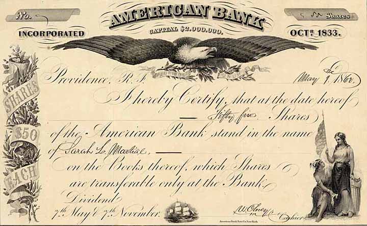 | Vorheriges Los | Zurück | Nächstes Los | | Losnr.: | 5 (U.S.A.) | | Titel: | American Bank | | Auflistung: | 55 shares à 50 $ 1.5.1860. | | Ausruf: | 250,00 EUR | Ausgabe- datum: | 01.05.1860 | Ausgabe- ort: | Providence, Rhode Island | | Abbildung: |  | | Stücknr.: | 7 | | Info: | Die American Bank wurde 1833 gegründet in Providence, Rhode Island. Die Hafenstadt an der Narragansettbai, einer Bucht des Atlantischen Ozeans, eine der ältesten Städte der Vereinigten Staaten, wurde bereits 1636 von Roger Williams gegründet. Die Stadt ist reich geworden durch Sklavenhandel, Teehandel und Walfang. Im 19. Jh. wurde der Handel durch die Industrie abgelöst. | | Besonder-heiten: | Sehr dekorative Aktiengestaltung, oben mittig Weisskopfadler, unten kleines Segelschiff, rechts Liberty. | | Verfügbar: | Nicht entwertet. | | Erhaltung: | EF-VF. | | Zuschlag: | 250,00 EUR |