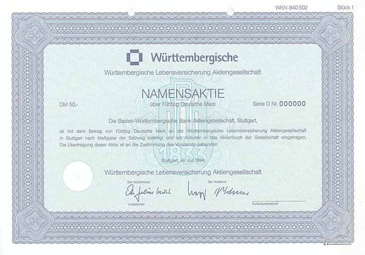 | Vorheriges Los | Zurück | Nächstes Los | | Losnr.: | 1919 (Deutschland ab 1948 (Die Deutsche Mark)) | | Titel: | Württembergische Lebensversicherung AG | | Auflistung: | Namensaktie Ser. D 50 DM Juli 1994 (nullgeziffertes Muster, R 10). | | Ausruf: | 100,00 EUR | Ausgabe- datum: | 01.07.1994 | Ausgabe- ort: | Stuttgart | | Abbildung: |  | | Info: | Gründung bereits 1833 als Versicherungsverein auf Gegenseitigkeit, 1923 Umwandlung in die Allgemeine Rentenanstalt Lebens- und Rentenversicherungs-AG. 1991 Umfirmierung wie oben, 2000 Fusion mit der Wüstenrot Lebensversicherungs-AG. | | Verfügbar: | Von dieser Emission sind ausgestellte Stücke überhaupt nicht bekannt, deshalb ein „Muß“. (R 10) | | Erhaltung: | Abheftlochung, sonst UNC. | | Zuschlag: | offen |
