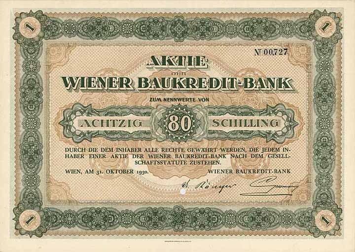 | Vorheriges Los | Zurück | Nächstes Los | | Losnr.: | 462 (k.u.k Monarchie / Nachfolgestaaten) | | Titel: | Wiener Baukredit-Bank | | Auflistung: | Aktie 80 S 31.10.1930 (Aktienneudruck nach Kapitalschnitt, Auflage 1250, R 2). | | Ausruf: | 20,00 EUR | Ausgabe- datum: | 31.10.1930 | Ausgabe- ort: | Wien | | Abbildung: |  | | Stücknr.: | 727 | | Info: | Gegründet 1909 mit der Berechtigung, Baukredite bis zu einem Drittel des Verkehrswertes zu gewähren. Nach der Hyperinflation schlief das Geschäft Ende der 1920er Jahre vollkommen ein: „Durch das vollständige Darniederliegen der privaten Bautätigkeit war die Ges. ihrem eigentlichen Wirkungskreise entzogen. Die letzten Jahre waren der Durchführung einer radikalen Entschuldungsaktion gewidmet. 1929 waren sämtliche Verpflichtungen bis auf eine Steuerverbindlichkeit liquidiert.“ 1930 wurde die Bank durch Vertrag mit der Geschäftsstelle für Wohnbauförderung beauftragt, alle Neubauten im Rahmen der Wohnbauförderungsaktion fortlaufend zu kontrollieren und die Bundeszuschüsse gemäß Baufortschritt auszuzahlen. Die Aktien notierten im Wiener Exotenverkehr. | | Besonder-heiten: | Lochentwertet (RB). | | Verfügbar: | Wie auch das folgende Los bislang vollkommen unbekannt gewesen. (R 2) | | Erhaltung: | UNC. | | Zuschlag: | 20,00 EUR |