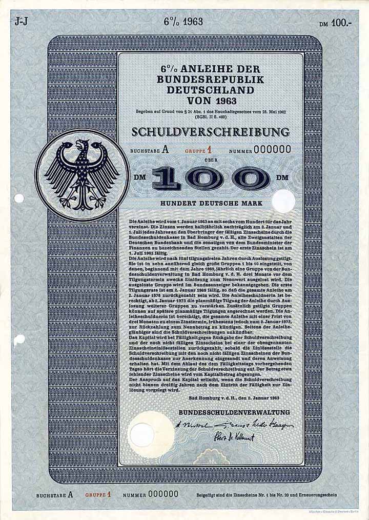 | Vorheriges Los | Zurück | Nächstes Los | | Losnr.: | 1143 (Deutschland ab 1948 (Die Deutsche Mark)) | | Titel: | Bundesrepublik Deutschland | | Auflistung: | 6 % Schuldv. 100 DM 2.1.1963 (Blankette, R 10). | | Ausruf: | 50,00 EUR | Ausgabe- datum: | 02.01.1963 | Ausgabe- ort: | Bad Homburg v.d.H. | | Abbildung: |  | | Besonder-heiten: | Mit Bundesadler. | | Verfügbar: | Mit Kupons. (R 10) | | Erhaltung: | EF. | | Zuschlag: | offen |