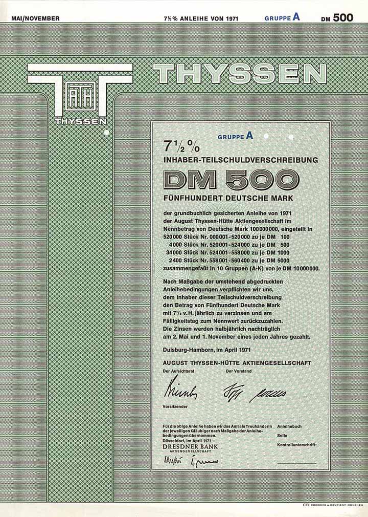 | Vorheriges Los | Zurück | Nächstes Los | | Losnr.: | 1093 (Deutschland ab 1948 (Die Deutsche Mark)) | | Titel: | August Thyssen-Hütte AG | | Auflistung: | 7,5 % Teilschuldv. 500 DM April 1971 (Blankette, R 10). | | Ausruf: | 50,00 EUR | Ausgabe- datum: | 01.04.1971 | Ausgabe- ort: | Duisburg-Hamborn | | Abbildung: |  | | Info: | Begründer des Thyssen-Konzerns war August Thyssen. Sein Vater Friedrich Thyssen betrieb in Eschweiler zunächst ein Drahtwalzwerk, dann ein Bankgeschäft. 1871 gründete August Thyssen in Mülheim (Ruhr) mit der KG Thyssen & Co. ein Puddel- und Walzwerk. 1885 begann er, mit dem Aufkauf von Kuxen der Gewerkschaft Deutscher Kaiser eine eigene Kohlengrundlage zu schaffen (1888 wurde er dort Vorsitzender des Grubenvorstands). Seine spätere Struktur erlangte der Thyssen-Konzern 1919, als die Gewerkschaft Deutscher Kaiser unter Übernahme der gesamten Thyssen'schen Unternehmungen ihren Namen in Gewerkschaft August Thyssen-Hütte änderte. Der Bergwerksbesitz wurde dann in die Gewerkschaft Friedrich Thyssen ausgegliedert. Am 5.5.1926, kurz vor seinem Tod, unterzeichnete August Thyssen noch den Vertrag zur Einbringung dieser Unternehmen in die Vereinigte Stahlwerke AG. AG wurde die August Thyssen-Hütte erst 1933, als die Vereinigten Stahlwerke die Thyssen-Betriebe in eine eigene AG ausgliederten. Unter gleichem Namen entstand 1953 die AG neu, als letzte der Nachfolgegesellschaften der von den Alliierten zerschlagenen Vereinigte Stahlwerke AG. 1977 Umfirmierung in Thyssen AG, heute ThyssenKrupp. | | Verfügbar: | Lochentwertet. (R 10) | | Erhaltung: | EF. | | Zuschlag: | offen |