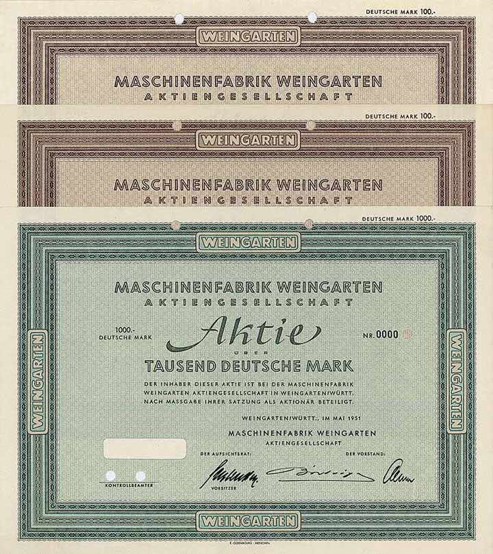 | Vorheriges Los | Zurück | Nächstes Los | | Losnr.: | 1630 (Deutschland ab 1948 (Die Deutsche Mark)) | | Titel: | Maschinenfabrik Weingarten AG (3 Stücke) | | Auflistung: | 100 DM + 1.000 DM Mai 1951, 100 DM Juni 1952 (alle nullgeziffert). | | Ausruf: | 100,00 EUR | Ausgabe- ort: | Weingarten/Württ. | | Abbildung: |  | | Info: | Die 1866 von Heinrich Schatz gegründete Maschinenfabrik produzierte zunächst Kettenstichstickmaschinen. Ein 1884 erteiltes Patent für eine Hebelblechschere markierte die Umstellung der Produktion auf Blechbearbeitungsmaschinen. 1898 Umwandlung in die Maschinenfabrik Weingarten vorm. Hch. Schatz AG. 1945 wurde die Fabrik fast völlig demontiert, 1958-60 erfolgte ein Werksneubau auf der grünen Wiese. Großpressen für die Automobilindustrie (deren Produktion schon seit 1925 lief) und Stanzautomaten waren nun die Haupterzeugnisse. 1982 Fusion mit dem größten Wettbewerber (Müller Pressen- und Maschinenfabrik GmbH, Esslingen a.N.) zur Maschinenfabrik Müller-Weingarten AG. 2007 Übernahme durch die Schuler AG. | | Erhaltung: | EF. | | Zuschlag: | 100,00 EUR |