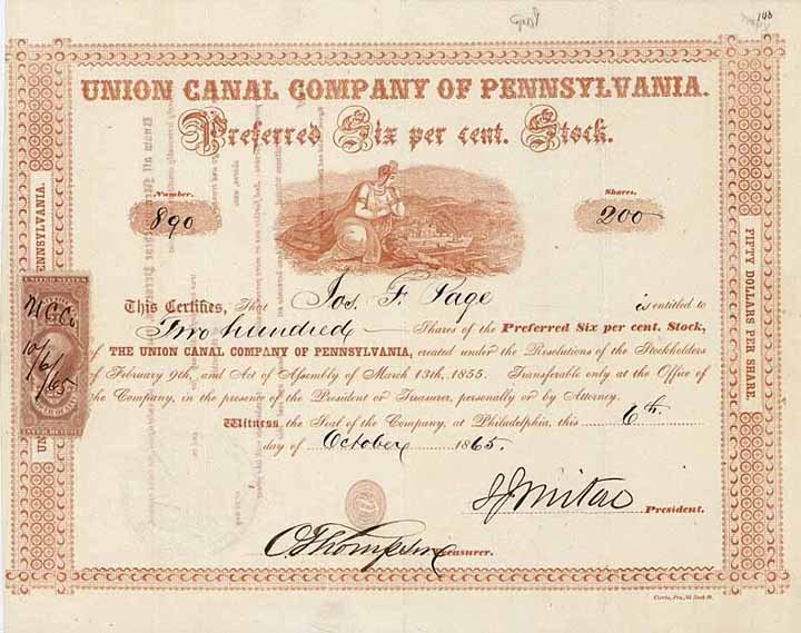 | Vorheriges Los | Zurück | Nächstes Los | | Losnr.: | 274 (U.S.A.) | | Titel: | Union Canal Co. of Pennsylvania | | Auflistung: | 200 6 % preferred shares à 50 $ 6.10.1865. | | Ausruf: | 180,00 EUR | Ausgabe- datum: | 06.10.1865 | Ausgabe- ort: | Philadelphia, Pa. | | Abbildung: |  | | Stücknr.: | 890 | | Info: | Gegründet im April 1811. William Penn, der Gründer der Kolonie Pennsylvania, hatte den Kanalbau am Susquehanna River bereits 1690 angeregt. Die 1792 unter Präsident George Washington begonnenen Bauarbeiten mussten wegen Finanzierungsschwierigkeiten bald wieder eingestellt werden. 1795 genehmigte die Regierung von Pennsylvania eine Lotterie, um Mittel für den Bau des Kanals einzusammeln. Von den 33 Mio. $, die diese Lotterie erbrachte, erreichten aber nur 270.000 $ das Kanalunternehmen. Erst mit dem Geld dieser 1811 gegründeten AG konnte der 77 Meilen lange Kanal von Reading nach Middletown, Pa. 1828 fertiggestellt werden. Er überwand mit seinen 88 Schleusen einen Höhenunterschied von 501 Fuß und war normalerweise von April bis Mitte Dezember in Betrieb. Der Kanal war für den Staat Pennsylvania so wichtig, daß er das Unternehmen für 25 Jahre von allen Steuern befreite. Die Konkurrenz der 1857 erbauten Lebanon Valley Railroad von Reading nach Harrisburg ließ die Einnahmen der Kanalgesellschaft kontinuierlich zurückgehen, was dann 1881 zur Schließung des Kanals führte. | | Besonder-heiten: | Druck ganz in karminrot. Vignette einer Göttin, die von einer Anhöhe aus das Treiben auf dem Fluß mit Lastkahn und Raddampfer und die Stadt am Ufer beobachtet. | | Verfügbar: | Unentwertet. Seit über 20 Jahren nicht mehr angeboten worden! | | Erhaltung: | VF+. | | Zuschlag: | 180,00 EUR |