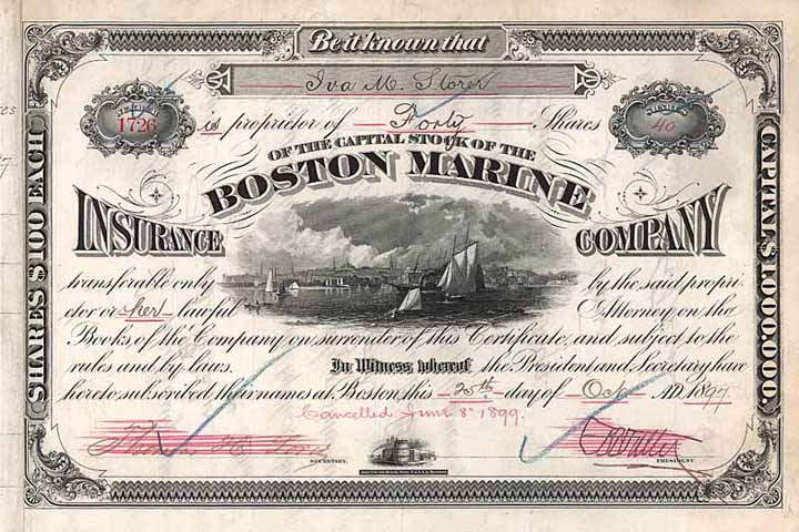 | Vorheriges Los | Zurück | Nächstes Los | | Losnr.: | 27 (U.S.A.) | | Titel: | Boston Marine Insurance Co. | | Auflistung: | 47 shares à 100 $ 18.1.1894. | | Ausruf: | 60,00 EUR | Ausgabe- datum: | 25.10.1897 | Ausgabe- ort: | Boston | | Abbildung: |  | | Stücknr.: | 1577 | | Info: | Die Gründung dieser uralten Seeversicherung wurde von den Parlamenten von Massachusetts bereits 1799 genehmigt. Anfangs bestand das Kapital aus 8.250 Aktien zu je 1.000 $ und es wurden Schiffe gegen Verlust und Piraterie versichert. | | Besonder-heiten: | ABNC-Stahlstich, herrliche Vignette mit Ansicht von Boston von der Seeseite, im Vordergrund Segelschiffe und Raddampfer. | | Erhaltung: | VF+. | | Zuschlag: | 70,00 EUR |