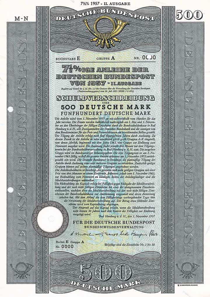 | Vorheriges Los | Zurück | Nächstes Los | | Losnr.: | 1742 (Deutschland ab 1948 (Die Deutsche Mark)) | | Titel: | Deutsche Bundespost | | Auflistung: | 7,5 % Schuldv. 500 DM 1.11.1957 (nullgeziffertes Muster, R 10). | | Ausruf: | 40,00 EUR | Ausgabe- datum: | 01.11.1957 | Ausgabe- ort: | Bad Homburg v.d.H. | | Abbildung: |  | | Info: | Nachfolgerin der Deutschen Reichspost, die mit der Reichsgründung 1871 aus der 1868 entstandenen Norddeutschen Bundespost entstanden war. Zunächst ein reichs- bzw. später bundesunmittelbares Unternehmen, mit der Postreform 1989 aufgeteilt in die eigenständigen Unternehmensbereiche DBP Postbank, DBP Postdienst und DBP Telekom, die später privatisiert und jeder für sich als Aktiengesellschaft an die Börse gebracht wurden. | | Besonder-heiten: | Wunderschöner Oldenbourg-Druck, Vignette mit leuchtend gelbem Posthorn, im Unterdruck ein Postillion mit Briefumschlag und Posthorn. | | Verfügbar: | R 10 | | Erhaltung: | Abheftlochung, sonst UNC. | | Zuschlag: | offen |