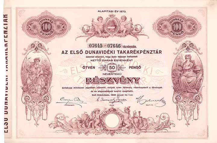 | Vorheriges Los | Zurück | Nächstes Los | | Losnr.: | 568 (Banken) | | Titel: | Elsö Dunavidéki Takarékpénztár (Erste Donaugegender Sparkassa) | | Auflistung: | Aktie 2 x 50 Pengö 1.1.1930. | | Ausruf: | 60,00 EUR | Ausgabe- datum: | 01.01.1930 | Ausgabe- ort: | Kiskörös | | Abbildung: |  | | Stücknr.: | 7645-46 | | Info: | Gründung 1873. Filialen in Kecel und Soltvadkert. | | Besonder-heiten: | Wunderschöne Gestaltung mit Putti, Bienenkorb, zwei weiblichen Allegorien. | | Erhaltung: | EF. | | Zuschlag: | offen |