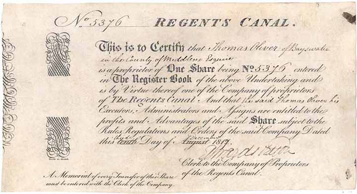 | Vorheriges Los | Zurück | Nächstes Los | | Losnr.: | 400 (Großbritannien) | | Titel: | Regents Canal | | Auflistung: | Share 3.12.1817. | | Ausruf: | 250,00 EUR | Ausgabe- datum: | 03.12.1817 | | Abbildung: |  | | Stücknr.: | 5358 | | Info: | Bedeutender Kanal, gebaut um den Grand Junction Canal mit der Themse zu verbinden. Der berühmte Architekt John Nash, Direktor der Kanalgesellschaft, war eng mit dem Prinzregenten befreundet, dem späteren König George IV. Ihm zu Ehren benannte er die Wasserstraße und die Gesellschaft “Regent’s Canal”. Die Gründung erfolgte 1812. Gebaut wurde bis 1820, obwohl Teilstrecken bereits 1816 dem Verkehr übergeben wurden. 1882 wurde die Gesellschaft reorganisiert und in “Regent’s Canal, City & Docks Railway Co.” umbenannt. 1900 Namensänderung zu “Regent’s Canal & Dock Co.”. 1948 wurde der Kanal verstaatlicht, unterstellt der British Transport Commission. 1956 wurde zum letzten Mal eine Barke von Pferden auf dem Kanal gezogen. | | Besonder-heiten: | Kupferstich auf Tierhaut, original signiert. | | Verfügbar: | Rarität. | | Erhaltung: | EF-VF. | | Zuschlag: | offen |