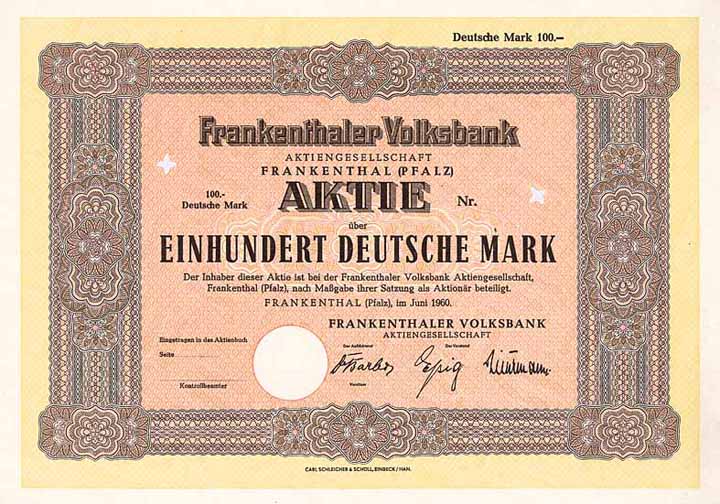 | Vorheriges Los | Zurück | Nächstes Los | | Losnr.: | 1444 (Deutschland ab 1948 (Die Deutsche Mark)) | | Titel: | Frankenthaler Volksbank AG | | Auflistung: | Aktie 100 DM Juni 1960 (Blankette, R 10). | | Ausruf: | 100,00 EUR | Ausgabe- datum: | 01.06.1960 | Ausgabe- ort: | Frankenthal | | Abbildung: |  | | Info: | Gründung als AG im Jahr 1889, umgewandelt aus der Volksbank Frankenthal eG. Zweigniederlassungen in Oppau a.Rh., Dirmstein, Freinsheim und Weisenheim am Sand. Ende der 60er Jahre in der Dresdner Bank AG, Mannheim aufgegangen. Die Filiale Frankenthal der Dresdner Bank (heute die Commerzbank) firmiert immer noch mit dem Zusatz "ehemals Frankenthaler Volksbank AG". | | Verfügbar: | Sternchenentwertet. (R 10) | | Erhaltung: | EF. | | Zuschlag: | offen |