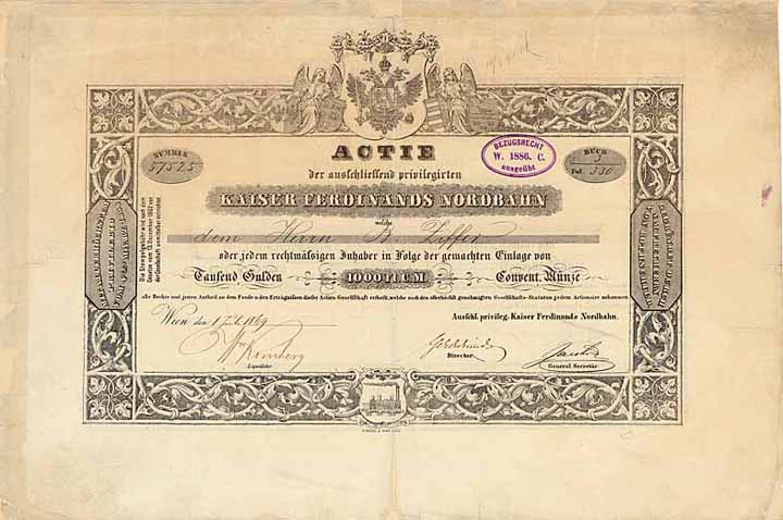 | Vorheriges Los | Zurück | Nächstes Los | | Losnr.: | 465 (k.u.k Monarchie / Nachfolgestaaten) | | Titel: | Kaiser Ferdinands Nordbahn | | Auflistung: | Aktie 1.000 Gulden 1.7.1869 (R 10). | | Ausruf: | 500,00 EUR | Ausgabe- datum: | 01.07.1869 | Ausgabe- ort: | Wien | | Abbildung: |  | | Stücknr.: | 57525 | | Info: | Insgesamt 10 Aktienemissionen in den Jahren 1836, 1844, 1852, 1854, 1856, 1857, 1862, 1866, 1869 und 1872 brachten das Aktienkapital auf gewaltige 74.511.250 Gulden. Ausgegeben waren ganze, halbe und fünftel Aktien. Mit einem Streckennetz von über 1.000 km (Hauptlinie: Wien-Krakau, 412 km) war die Kaiser Ferdinands-Nordbahn die größte Privatbahn der Donaumonarchie. Aber sie hält noch einen wichtigeren Rekord: Ihre am 17.11.1837 eröffnete Strecke Floridsdorf-Wagram war überhaupt die erste Lokomotiv-Eisenbahn in Österreich! Hauptinitiator der Nordbahn war Salomon Mayer Freiherr von Rothschild (1774-1855), zweiter Sohn von Mayer Anselm Rothschild, der die Leitung des Wiener Hauses übernahm. Salomons Engagement im Eisenbahnbau hatte den Einstieg in Bergbau und Industrie nach sich gezogen. Folgerichtig ergaben sich weitere Beteiligungen, etwa an der Wiener Locomotiv Fabriks AG. 1906 wurden die Eisenbahnen der Nordbahn verstaatlicht, die Gesellschaft blieb aber dank ihres riesigen Montanbesitzes in Mährisch-Ostrau eine bis Ende des 2. Weltkrieges börsennotierte AG. Für die Erfüllung der Altverpflichtungen hatten nach der Zerschlagung der Donaumonarchie die Staaten Deutschösterreich, Tschechoslowakei und Polen gemeinsam zu sorgen, da die Bahn nun in allen drei Staaten lag. | | Besonder-heiten: | Äußerst dekorative Umrahmung mit Doppeladler, Engeln die Wappenschilde halten und einer Uralt-Lok. | | Verfügbar: | Eine wirtschaftsgeschichtlich hochbedeutende Rarität. Einrisse und Randbeschädigungen fachgerecht restauriert. (R 10) | | Erhaltung: | VF. | | Zuschlag: | offen |