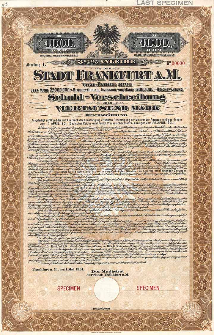 | Vorheriges Los | Zurück | Nächstes Los | | Losnr.: | 1153 (Deutschland bis 1945 (Nicht Reichsbank)) | | Titel: | Stadt Frankfurt a.M. | | Auflistung: | 3,5 % Schuldv. Abt. I 4.000 Mark 1.5.1901 (specimen, R 10). | | Ausruf: | 200,00 EUR | Ausgabe- datum: | 01.05.1901 | Ausgabe- ort: | Frankfurt a.M. | | Abbildung: |  | | Besonder-heiten: | Teil einer Anleihe in Höhe von 27 Mio. M (davon Abt. I 15 Mio. M). Zuerst hielten wir dies, auch wegen des “unnormalen” Erscheinungsbildes und der völlig ungewöhnlichen Nennwerte, für einen Probedruck ohne realen Hintergrund, aber das stimmt nicht. Das zeitgenössische Börsenhandbuch belehrt uns eines besseren: “Stadt-Anleihe von 1901, Abt. I M 15 Mio. in Stücken á M 2.000, 4.000 ... Zahlst.: Frankf. a.M.: Stadt-Hauptkasse; New York: Speyer & Co. Aufgelegt in New York am 21.3.1901 zu 96 % ... Notiert in Frankf. a.M., ausserdem in New York. Anmerkung: Die Stücke der Anleihe von 1901, Abt. I sind gemäss der New Yorker Börsenvorschrift in Stahlstich und nicht in Lithographie hergestellt worden.” Der dennoch ausschließlich in deutscher Sprache gehaltene Text schreibt (in Sperrschrift!) Bekanntmachungen die Anleihe betreffend auch in zwei in den Vereinigten Staaten von Amerika erscheinenden Zeitungen vor. | | Verfügbar: | Eines des interessantesten Stücke aus dem ABNC-Archiv. Mit Stempel “Last Specimen” - nur dieses eine Stück wurde im ABNC-Archiv gefunden. (R 10) | | Erhaltung: | EF-VF. | | Zuschlag: | offen |