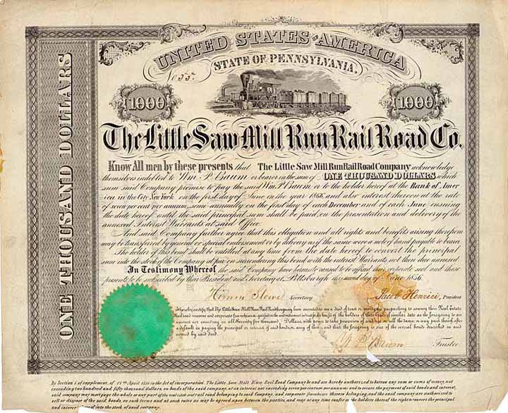 | Vorheriges Los | Zurück | Nächstes Los | | Losnr.: | 146 (U.S.A.) | | Titel: | Little Saw Mill Run Railroad | | Auflistung: | 7 % Bond 1.000 $ 2.6.1856 (Auflage 250). | | Ausruf: | 180,00 EUR | Ausgabe- datum: | 02.06.1856 | Ausgabe- ort: | Pittsburgh, Pa. | | Abbildung: |  | | Stücknr.: | 55 | | Info: | Vorläufer war eine Pferdebahn gewesen, die der Harmony Society gehörte. Gründung 1850, Betriebseröffnung 1853. Die 21 Meilen lange normalspurige Bahn von Temperanceville, Pa. am Ohio River nach Banksville, Pa. verlief parallel zum Flüsschen Saw Mill Run. Die Strecke wurde auch von der schmalspurigen Pittsburgh Southern RR mitbenutzt und war deshalb dreischienig. Durch Verschmelzung mit der West Side Belt RR 1897 zum Eisenbahn-Imperium von George J. Gould gekommen. | | Besonder-heiten: | Schöne Vignette eines Güterzuges, im Hintergrund ein Raddampfer. | | Verfügbar: | Bei uns noch nie zuvor angeboten, Einzelstück aus einer uralten US-Sammlung. | | Erhaltung: | VF-F. | | Zuschlag: | 210,00 EUR |