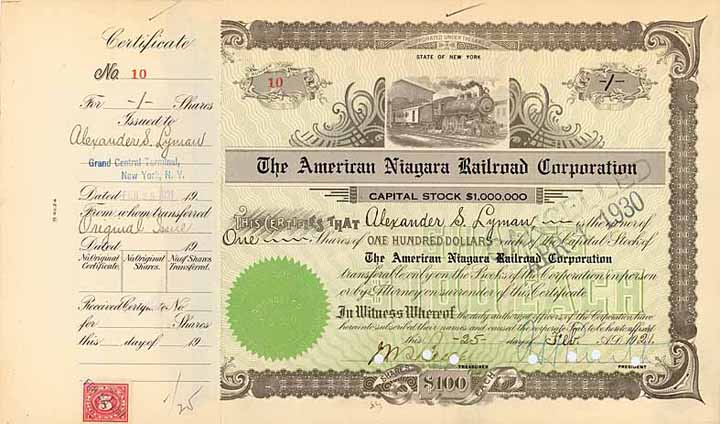 | Vorheriges Los | Zurück | Nächstes Los | | Losnr.: | 8 (U.S.A.) | | Titel: | American Niagara Railroad | | Auflistung: | 1 share á 100 $ 25.2.1921. | | Ausruf: | 150,00 EUR | Ausgabe- datum: | 25.02.1921 | Ausgabe- ort: | New York | | Abbildung: |  | | Stücknr.: | 10 | | Info: | Die 86 km2 große Insel Grand Island im Niagara River wurde 1822 den USA zugesprochen und entwickelte sich Ende des 19. Jh. zu einem beliebten Urlaubsort, besaß aber keine Brücke zum Festland (erst 1935 wurde mit Arbeitsbeschaffungsmitteln des „Great Deal“ tatsächlich eine Straßenbrücke gebaut). Schon vorher hatten in den 1920er Jahren die New York Central und die American Niagara RR den Bau einer Eisenbahnbrücke überlegt. 1923 erhielt die 1920 gegründete American Niagara RR die Konzession, den Staat New York durch zwei Brücken via Grand Island mit der Provinz Ontario zu verbinden. Standard Oil begann sogar schon große Öltanks auf Grand Island zu errichten - doch gebaut wurden die Eisenbahnbrücken am Ende nie (obwohl ausweislich weiterer bekannter Zertifikate die American Niagara RR bis mindestens in die 1940er Jahre weiter existierte). | | Besonder-heiten: | Vignette mit Personenzug vor der Bahnhofshalle. | | Verfügbar: | Einzelstück aus einer uralten US-Sammlung, bei uns noch nie angeboten gewesen. | | Erhaltung: | EF+. | | Zuschlag: | offen |