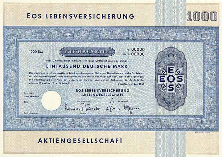 | Vorheriges Los | Zurück | Nächstes Los | | Losnr.: | 1426 (Deutschland ab 1948 (Die Deutsche Mark)) | | Titel: | Eos Lebensversicherung AG | | Auflistung: | Global-Namensaktie 10 x 100 DM Juni 1965 (nullgeziffertes Muster, R 10). | | Ausruf: | 80,00 EUR | Ausgabe- datum: | 01.06.1965 | Ausgabe- ort: | Düsseldorf | | Abbildung: |  | | Info: | Gründung 1926 in Berlin als “Excelsior” Lebensversicherungs-AG. 1933 Fusion mit der “Eos” Deutscher Bestattungs- und Lebensversicherungs-Verein AG zur “Eos und Excelsior Deutsche Volks- und Lebensversicherungs-AG” und Sitzverlegung nach Düsseldorf. Übernommen wurden 1936 die “Saarland” Lebensversicherungs-AG, 1937 der Bestand des “BLV Bestattungs- und Lebensversicherungsvereins a.G.” in Berlin und 1938 die “Lebensversicherungsgesellschaft Schwaben VVaG” in Stuttgart. 1970 Sitzverlegung nach München. 1974 Zusammenschluß mit der Aachen-Leipziger, der Berlinischen Feuer, der Saar-Rhein Allgemeine, der Salus und der Vereinigte Krankenversicherung zur “Vereinigte Versicherungsgruppe”. Großaktionär war damals die Swiss Re. Später übernahm die Allianz-Versicherung die immer noch börsennotierte Vereinte Versicherung AG und gliederte sie sich 2002 per “squeeze out” vollständig ein. | | Verfügbar: | Mit Kupons. Ungültig-perforiert. (R 10) | | Erhaltung: | UNC-EF. | | Zuschlag: | 80,00 EUR n |
