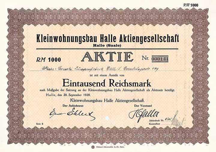 | Vorheriges Los | Zurück | Nächstes Los | | Losnr.: | 1917 (Wertpapiere mit der Nr. 007) | | Titel: | Kleinwohnungsbau Halle AG | | Auflistung: | Namens-Aktie 1.000 RM 28.9.1939 (Auflage 180, R 5). | | Ausruf: | 30,00 EUR | Ausgabe- datum: | 28.09.1939 | Ausgabe- ort: | Halle (Saale) | | Abbildung: |  | | Stücknr.: | 7 | | Info: | Gegründet 1922 unter maßgeblicher Beteiligung der Stadt Halle a.S. zur Schaffung gesunder Kleinwohnungen in Halle und Umgebung für die minderbegüterte Bevölkerung. 1925 Anerkennung der Gemeinnützigkeit. Anfang der 30er Jahre wurden auf dem Gelände westlich der Merseburger Straße an der Kasseler Bahn 280 Einfamilienhäuder als Doppelhaushälften errichtet. Ende 1941 befanden sich 929 Häuser mit 3.486 Wohnungen im Bestand. Großaktionäre waren die Stadtgemeinde Halle, der Wohnungsverein Halle-Süd eGmbH, der Wohnstätten-Spar- und Bauverein Halle und der I.G.Farben-Konzern mit dem Ammoniakwerk Merseburg (Leunawerke). | | Besonder-heiten: | Lochentwertet (RB). | | Verfügbar: | R 5 | | Erhaltung: | UNC. | | Zuschlag: | offen |