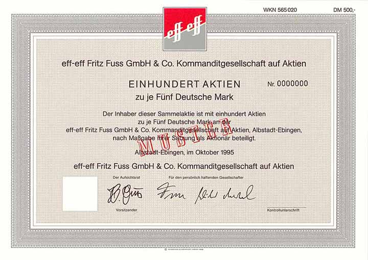 | Vorheriges Los | Zurück | Nächstes Los | | Losnr.: | 2035 (Deutschland ab 1948 (Die Deutsche Mark)) | | Titel: | eff-eff Fritz Fuss GmbH & Co. KGaA | | Auflistung: | Sammelaktie 100 x 5 DM Okt. 1995 (nullgeziffertes Muster, R 10). | | Ausruf: | 40,00 EUR | Ausgabe- datum: | 01.10.1995 | Ausgabe- ort: | Albstadt-Ebingen | | Abbildung: |  | | Info: | 1936 Gründung des Unternehmens Fritz Fuss als “Werkstatt für Feinmechanik und Elektrotechnik“. 1947 Start der Türöffner-Produktion, 1959 Umwandlung in eine KG, ab 1971 Alarmsysteme im Programm, ab 1977 Brandmeldetechnik, ab 1983 Zutrittskontrollanlagen. 1990 Werksneubau am Stadtrand von Albstadt. 1995 Umwandlung in eine KGaA und Börsengang. 2000 Übernahme durch den Sicherheitstechnik-Riesen ASSA ABLOY. 2004 Fusion mit der zweiten deutschen ASSA ABLOY-Tochter Zeiss IKON und squeeze-out der Kleinaktionäre. An die letzte HV erinnert sich der Katalogschreiber noch äußerst lebhaft: Es war das größte an Harmonie, was er in einem squeeze-out-Verfahren je erlebt hat. Denn schon im Vorfeld der HV waren der Großaktionär und die SdK zu einem beide Seiten befriedigenden Kompromiß gekommen, und so warb der SdK-Vertreter auf der HV dann mit warmen Worten um Zustimmung für den squeeze-out. | | Verfügbar: | Mit kpl. Kuponbogen. (R 10) | | Erhaltung: | UNC. | | Zuschlag: | offen |