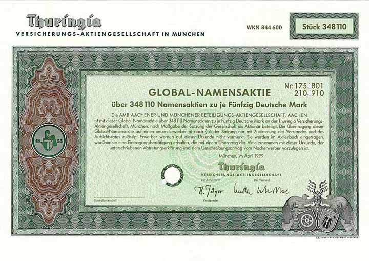 | Vorheriges Los | Zurück | Nächstes Los | | Losnr.: | 2205 (Deutschland ab 1948 (Die Deutsche Mark)) | | Titel: | Thuringia Versicherungs-AG | | Auflistung: | Global-Namensaktie 348.110 x 50 DM April 1999 (Muster, R 10) für die AMB Aaachener und Münchener Beteiligungs-AG. | | Ausruf: | 200,00 EUR | Ausgabe- datum: | 01.04.1999 | Ausgabe- ort: | München | | Abbildung: |  | | Info: | Gründung 1853 als "THURINGIA Eisenbahn- und allgemeine Rückversicherungs-Gesellschaft". Sitzverlegungen 1945 nach Hannover, 1946 nach Hann. Münden und 1950 nach München. Bis nach 2000 noch börsennotierte Gesellschaft, gehört zur Aachener und Münchener-Gruppe (Squeeze-Out der Kleinaktionäre). | | Besonder-heiten: | Sehr hübscher G&D-Druck mit Stadtwappen von Erfurt und München. | | Verfügbar: | R 10 | | Erhaltung: | UNC-EF. | | Zuschlag: | offen |