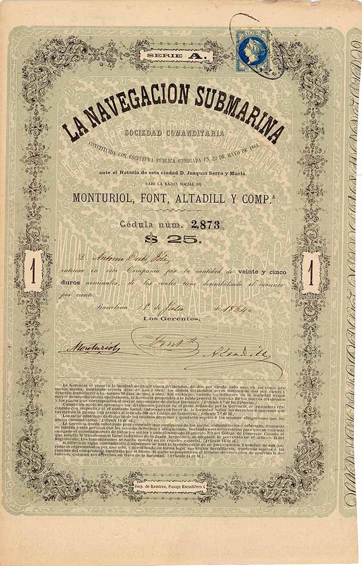 | Vorheriges Los | Zurück | Nächstes Los | | Losnr.: | 652 (Spanien) | | Titel: | La Navegacion Submarina | | Auflistung: | Namensaktie Serie A 25 Duros 19.7.1864. | | Ausruf: | 300,00 EUR | Ausgabe- datum: | 19.07.1864 | Ausgabe- ort: | Barcelona | | Abbildung: |  | | Stücknr.: | 2947 | | Info: | Um die Kapitalbeschaffung für Unterseeboote zu beschaffen wird die La Navigacion Submarina am 22. Mai 1964 als AG gegründet. Diese hat ein Kapital von 58.900 Duros (ca. 600.000 €) unterteilt in 2536 Aktien zu 25 Duros (ca. 250 €). | | Besonder-heiten: | Die Aktie ist von Narciso Monturiol (1819-1885), dem Erfinder des ersten tauchfähigen Unterseebootes "Ictineo" Original unterschrieben. Ebenso von Font und Altadil. Monturiol studierte Rechtswissenschaft an den Universitäten von Barcelona und Madrid, obwohl seine Zuneigung der Naturwissenschaft und Physik galt. Später esidierte er sehr isoliert in Cadaques wegen den ständigen Verfolgungen durch seine politische Einstellung. In dieser Isolation entstand der Plan für die Konstruktion eines Unterseebootes mit allen Problemlösungen der Konstruktion. Das war für die damalige Zeit genial, standen doch zu jener Zeit die heutigen technischen Hilfsmittel nicht zur Verfügung. Die ersten Tauchversuche wurden in den Jahren 1859, 1860, 1861 und 1862 in den Gewässern vor Barcelona und Alicante unternommen. Mittellos und ohne Unterstützung, fielen die zwei konstruierten "Ictineos" später in die Hände von Gläubigern, die sie zerstörten um die Einzelteile verkaufen zu können. Jahre später wurden die Pläne den Amerikanern verkauft. | | Verfügbar: | Doppelblatt, mit Firmengeschichte. | | Erhaltung: | EF-VF. | | Zuschlag: | 300,00 EUR |
