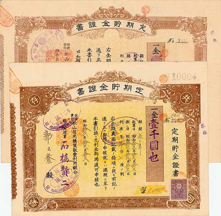| Vorheriges Los | Zurück | Nächstes Los | | Losnr.: | 328 (China) | | Titel: | Associated Chambers of Commerce (2 Stücke) | | Auflistung: | Saving Bond 100 Yen, #338; 1000 Yen, #494 von 1941. | | Ausruf: | 150,00 EUR | Ausgabe- datum: | 01.01.1941 | Ausgabe- ort: | Songshan | | Abbildung: |  | | Info: | Handelskammer des zentralen Bezirks der taiwanischen Hauptstadt Taipeh. | | Besonder-heiten: | Ausgegeben während der japanischen Besatzung von Taiwan. Dekorative graphische Gestaltung, Text nur in chinesisch. Rückseitig Eintragungen. | | Erhaltung: | EF-. | | Zuschlag: | 160,00 EUR |