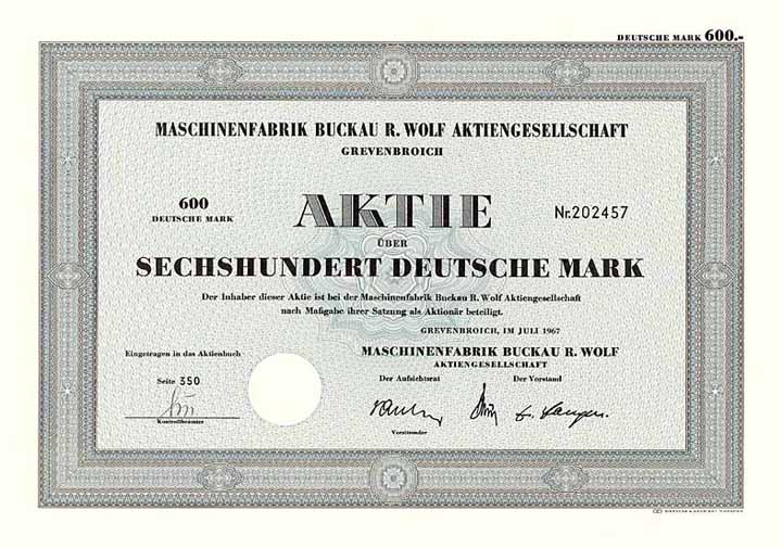 | Vorheriges Los | Zurück | Nächstes Los | | Losnr.: | 1706 (Deutschland ab 1948 (Die Deutsche Mark)) | | Titel: | Maschinenfabrik Buckau R. Wolf AG | | Auflistung: | Aktie 600 DM Juli 1967 (Auflage 10000, R 9). | | Ausruf: | 60,00 EUR | Ausgabe- datum: | 01.07.1967 | Ausgabe- ort: | Grevenbroich | | Abbildung: |  | | Stücknr.: | 202579 | | Info: | Eine der factettenreichsten Firmengeschichten, die wir je recherchiert haben! Gegründet bereits 1836 durch Magdeburger Kaufleute, den Reeder Fr. Andreae (der bereits 50 Schiffe auf der Elbe betrieb) und den Schiffsbauer Albrecht Tischbein als “Magdeburger-Dampfschifffahrts-Compagnie”. Bereits ihr erstes Dampfschiff (die “Kronprinz von Preußen”) baute die Gesellschaft einschließlich des Kessels in Elbnähe am Packhof in Magdeburg selbst. Die eigene Werft für Dampfschiffe wurde bald um eine Maschinenfabrik für Dampfmaschinen und Kessel erweitert. Dafür erwarb man von der Kloster-Berge-Stiftung oberhalb der bei dieser Gelegenheit schiffbar gemachten Sülze in der Gemarkung Buckau ein großes Grundstück, wohin Werft und Maschinenfabrik (im Volksmund bis Ende des 20. Jh. “Alte Bude” genannt) verlegt wurden. 1839 wurde das erste vollständig aus eigener Produktion stammende Dampfschiff “Stadt Magdeburg” als Seitenraddampfer gebaut. 1841 Vereinigung mit einem Hamburger Unternehmen zur “Vereinigten Hamburg-Magdeburger Dampfschifffahrts-Compagnie”. Neben zahlreichen Schiffsneubauten verließen die Maschinenfabrik nun auch Lokomotiven sowie Einrichtungen aller Art für die in der Region Magdeburg bedeutsamen Industriezweige wie Zuckerindustrie und Bergbau. Um 1850 waren bereits fast 1.000 Mitarbeiter beschäftigt, für die damalige Zeit war das Werk also schon ungeheuer groß. Die zumeist ungünstige Lage der Elbeschiffahrt, mit der das Unternehmen fast nur Verluste einfuhr, brachte die Verantwortlichen 1865 auf die Idee, nach dem Vorbild der Schifffahrt auf der Seine auch auf der Elbe Kettendampfer mit größerer Schleppkraft bei geringerem Energieverbrauch und Tiefgang einzusetzen. Unter der Leitung des Firmengründers Andreae wurde in Buckau 1868 das in Deutschland erste Kettenschiff gebaut. In Teilstrecken waren bis 1874 dann 233 km Kette bis nach Hamburg verlegt. Diese kluge Entscheidung ermöglichte 1869 erstmals die Zahlung einer Dividende. Obwohl die Elbeschiffahrt nun meist Gewinne einfuhr, übertrug man diesen Teilbetrieb 1880 gegen Gewährung von Aktien auf die Deutsche Elbeschifffahrtsgesellschaft “Kette”. Als Konsequenz wurde 1884 die “Vereinigte Hamburg-Magdeburger Dampfschifffahrts-Compagnie” umbenannt in “Maschinenfabrik Buckau AG”. In den 1880er Jahren wurden dann neben Dampfmaschinen und dem Kesselbau Einrichtungen für den Braunkohlebergbau und für Brikettfabriken der bestimmende Produktionszweig. 1906 wurde in Sudenburg die 1848 gegründete Maschinenfabrik Röhrig & König erworben und als Zweigwerk weitergeführt. Die ab 1921 bestehende Interessengemeinschaft mit der 1862 in unmittelbarer Nachbarschaft gegründeten Maschinenfabrik R. Wolf AG (Werke in Buckau und ab 1905 auch Salbke, die auf Lokomobile und Dreschmaschinen spezialisiert waren) mündete 1928 in eine Fusion zur “Maschinenfabrik Buckau R. Wolf AG”. Zuvor war 1924 übrigens eine Fusion zwischen Wolf und der Fa. Heinrich Lanz in Mannheim gescheitert - für Wolf ein Affront, nachdem man die in Schwierigkeiten geratene Fa. Heinrich Lanz durch Übernahme großer Bankbürgschaften gerade noch gerettet hatte. Ende der 1920er Jahre gewann für die Firma auch der Dieselmotorenbau große Bedeutung. Nach dem 2. Weltkrieg teilte sich die Entwicklung: Die 1946/47 von den Sowjets als “Maschinenfabrik Buckau Wolf der Sowjetischen Maschinenbau AG” in eine Sowjetische Aktiengesellschaft (SAG) überführten Betriebe in und um Magdeburg mit wieder fast 4.000 Beschäftigten wurden 1953 zum VEB Schwermaschinenbau “Karl Liebknecht” (SKL). 1956 wurde das Buckauer Werk herausgelöst und dem Georgij-Dimitroff-Werk (ehemals Maschinenfabrik Otto-Gruson) angegliedert. Neuer Sitz des VEB SKL mit nun schon 8.000 Beschäftigten wurde Salbke. 1970 wurde SKL das Stammwerk des Kombinats für Dieselmotoren und Industrieanlagen. 1990 wurde SKL von der Treuhandanstalt zerschlagen. Übrig blieb u.a. die nach der Wende zu MTU Friedrichshafen, heute zur Tognum-Gruppe gehörende SKL Motor GmbH. Die alte Aktiengesellschaft selbst wurde nach der Enteignung 1946/47 verlegt nach Grevenbroich in das dortige Zweigwerk (gegründet 1878 als Langen & Hundhausen, 1890 umgewandelt in die Maschinenfabrik Grevenbroich AG), wohin auch viele ehemalige Magdeburger und Salbker Mitarbeiter wechselten. Hier wurden zunächst Motoren, später auch wieder (wie schon einmal bis 1927) Maschinen für die Zuckerindustrie hergestellt. 1998 Umwandlung in die BWS Technologie GmbH, wobei BWS für Buckau-Wolf Supraton steht. | | Verfügbar: | Rückseitig entwertet. (R 9) | | Erhaltung: | UNC-EF. | | Zuschlag: | 60,00 EUR |