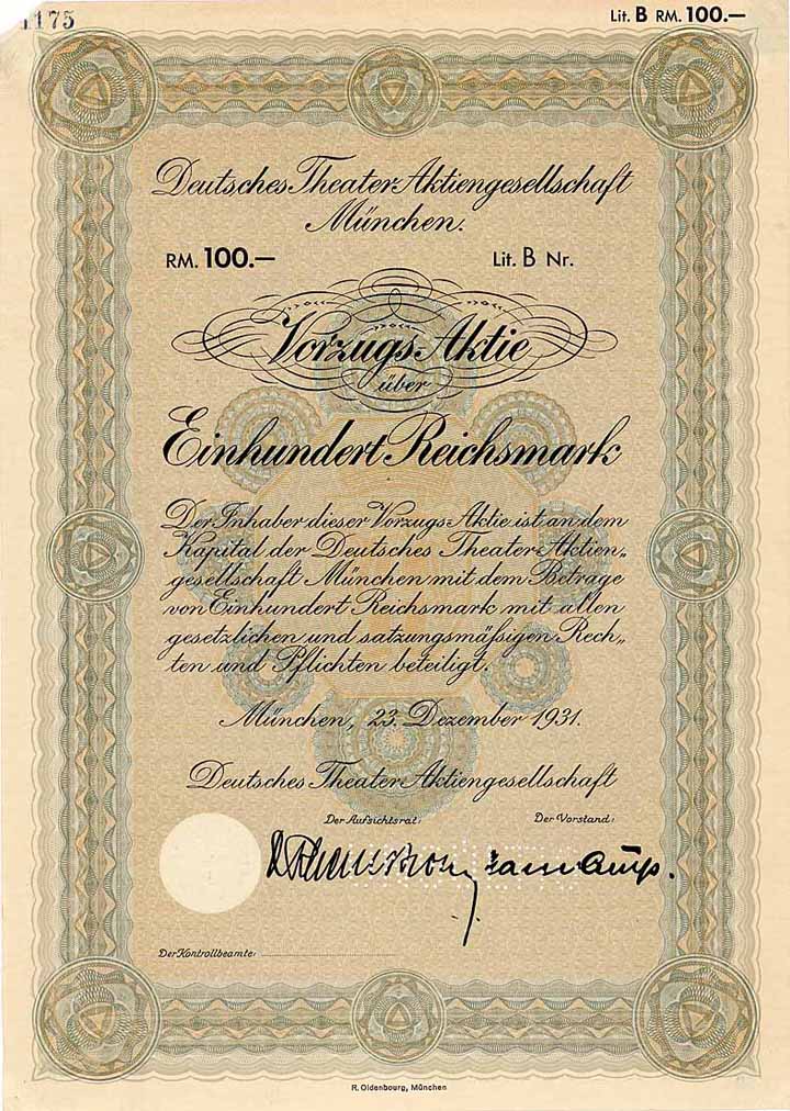 | Vorheriges Los | Zurück | Nächstes Los | | Losnr.: | 730 (Deutschland bis 1945) | | Titel: | Deutsches Theater | | Auflistung: | VZ-Aktie 100 RM 23.12.1931 (Muster der Gründeraktie, R 12). | | Ausruf: | 1.000,00 EUR | Ausgabe- datum: | 23.12.1931 | Ausgabe- ort: | München | | Abbildung: |  | | Info: | Das Deutsche Theater in München wurde von Alexander Blum, Josef Rank und Karl Stöhr im Stil des Neobarock erbaut und am 26. September 1896 eröffnet. Es wurde als Feenpalast bezeichnet und umfasste einen Theatersaal mit 1679 Sitzplätzen, einen kleinen Veranstaltungssaal (Silbersaal), Restaurants, ein Cafe, zahlreiche kleine Geschäfte sowie 30 Wohnungen. Seit der Eröffnung findet ab Januar bis zum Aschermittwoch die traditionelle Ballsaison mit festlichen Galas und Kostümbällen statt. Das Programm umfasst Musicals, Tanz, Shows, Operetten und Konzerte nationaler und internationaler Künstler. Im Februar 1919 tagte im Deutschen Theater der 1. Kongress der bayerischen Arbeiter- und Soldatenräte. In den 20er Jahren war das Theater der prächtigste Ort der Residenzstadt für glitzernde Revuen. Ab 1918 führte Hans Gruß das Theater, hier traten die Tiller Girls, Karl Valentin und andere auf, ein Gastspiel von Josephine Baker wurde 1929 aber verboten. Die Deutsche Theater AG wurde im Dez. 1931 von Theater-Direktor Hans Gruß, der Stadtgemeinde München sowie zahlreichen anderen Firmen gegründet. Nach der Machtübernahme durch die Nationalsozialisten wurde Gruß entlassen, Paul Wolz trat an seine Stelle. Am 9. März 1943 wurde das Theater durch Bomben zerstört, nur der neobarocke Silbersaal blieb verschont und ist bis heute der einzige erhalten gebliebene Raum des Originalbaus. 1951 wurde das teilweise wieder aufgebaute Gebäude wiedereröffnet. Ab 1965 übernahm Kurt Plapperer als Pächter die Direktion des Deutschen Theaters und finanzierte das Haus bis zu seinem Abschied aus seinen privaten Mitteln. Seit 1982 befindet sich das Theater in städtischer Hand als "Deutsches Theater München Betriebsgesellschaft mit beschränkter Haftung". Von 2008 bis 2014 wurde es saniert und am 17. Januar 2014 feierlich wiedereröffnet. | | Verfügbar: | Linke obere Ecke defekt, rückseitig Klebereste. Ungültig-perforiert. (R 12) | | Erhaltung: | VF. | | Zuschlag: | offen |