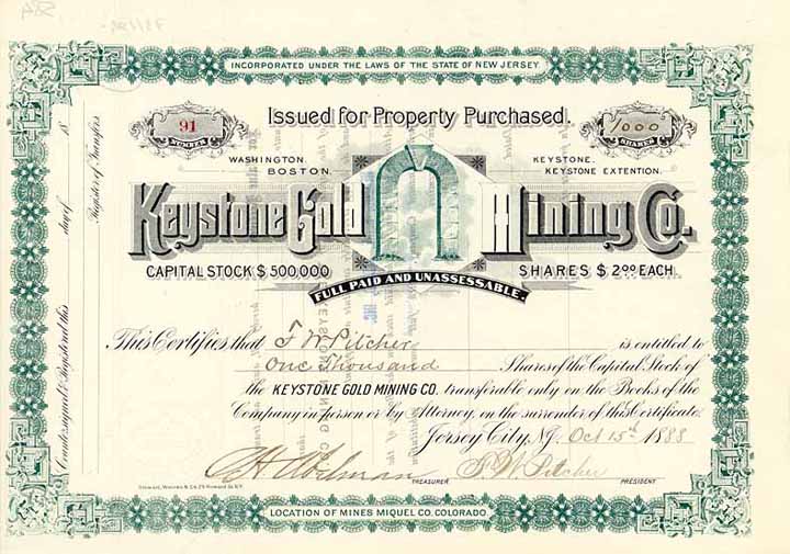 | Vorheriges Los | Zurück | Nächstes Los | | Losnr.: | 1761 (USA) | | Titel: | Keystone Gold Mining Co. | | Auflistung: | 1000 shares à 2 $ 15.10.1888. | | Ausruf: | 100,00 EUR | Ausgabe- datum: | 15.10.1888 | Ausgabe- ort: | Jersey City, N.J. | | Abbildung: |  | | Stücknr.: | 91 | | Info: | Im Jahr 1875 wurde in Battle Creek Gold entdeckt und die Minenarbeiter strömten nach Keystone mit der Hoffnung auf schnellen Reichtum. Die Keystone Gold Mining Co. wurde 1888 gegründet um die Miene Miquel in Colorado auszubeuten. | | Besonder-heiten: | Vignette mit Torbogen. | | Verfügbar: | Unentwertet. Aus alter Sammlung. | | Erhaltung: | EF. | | Zuschlag: | offen |