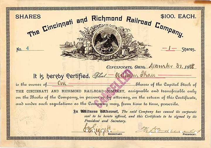 | Vorheriges Los | Zurück | Nächstes Los | | Losnr.: | 1686 (USA) | | Titel: | Cincinnati & Richmond Railroad | | Auflistung: | 1 share á 100 $ 31.12.1888. | | Ausruf: | 120,00 EUR | Ausgabe- datum: | 31.12.1888 | Ausgabe- ort: | Cincinnati,O. | | Abbildung: |  | | Stücknr.: | 4 | | Info: | Ursprünge sind die 1846 konzessionierte Richmond & Miami RR (von Richmond nach Südosten zur Ohio-Staatsgrenze) und die 1847 konzessionierte Eaton & Hamilton RR (die die R&M-Strecke südöstlich nach Eaton und südlich nach Hamilton verlängerte, 1866 als Cincinnati, Richmond & Chicago RR reorganisiert). Diese Bahn wurde 1881 gegründet zum Bau der 1888 in Betrieb gegangenen Verlängerung von Hamilton zur Rendcomb Junc. mit der Little Miami RR. Obwohl der „Youngster“ im Trio nahm die C&R 1890 die beiden viel älteren Schwestern fusionsweise auf. Zuletzt zur Pittsburgh, Cincinnati, Chicago & St. Louis und damit zum Pennsylvania-RR-System gehörend. | | Besonder-heiten: | Dreigeteilte Vignette mit Darstellung von Schifffahrt, Handel, Wappenadler und Landwirtschaft. | | Verfügbar: | Bei uns überhaupt erst ein einziges Mal (im Jahr 1997) auf der Auktion gewesen. | | Erhaltung: | VF+ | | Zuschlag: | 130,00 EUR |