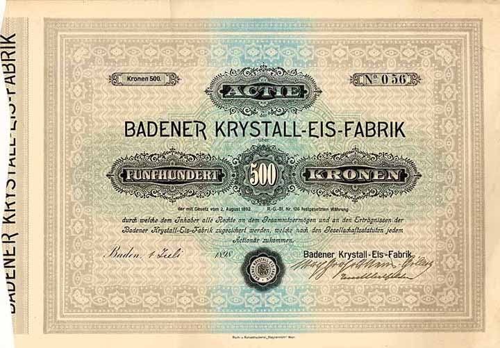 | Vorheriges Los | Zurück | Nächstes Los | | Losnr.: | 185 (k.u.k Monarchie / Nachfolgestaaten) | | Titel: | Badener Krystall-Eis-Fabrik | | Auflistung: | Actie 500 K 1.7.1898. Gründeraktie. | | Ausruf: | 200,00 EUR | Ausgabe- datum: | 01.07.1898 | Ausgabe- ort: | Baden bei Wien | | Abbildung: |  | | Stücknr.: | 56 | | Info: | Die 1898 gegründete Ges. machte sich anheischig, Bewohner und Betriebe der Stadt Baden mit ihren von morgens um 6 bis abends herumfahrenden Wagen mit Eis zu Kühlzwecken zu versorgen. Doch das Geschäftsmodell hatte keine Zukunft: Der Siegeszug der Kältemaschinen aus dem 1878 von Carl von Linde gegründeten Unternehmen war nicht aufzuhalten. | | Besonder-heiten: | Sehr hübsche Gestaltung. | | Verfügbar: | Unentwertet, mit kpl. Kuponbogen. Noch nie zuvor angeboten gewesen. | | Erhaltung: | EF+. | | Zuschlag: | 220,00 EUR |