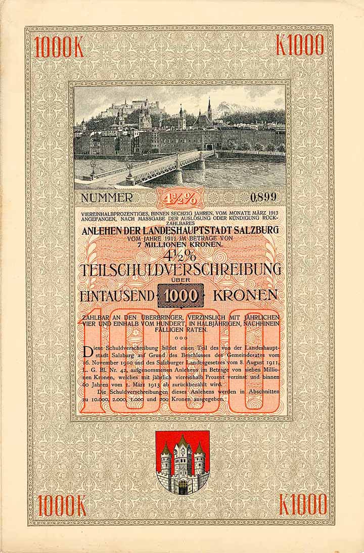 | Vorheriges Los | Zurück | Nächstes Los | | Losnr.: | 76 (k.u.k Monarchie / Nachfolgestaaten) | | Titel: | Landeshauptstadt Salzburg | | Auflistung: | 4,5 % Teilschuldv. 1.000 Kr. 1.9.1911. | | Ausruf: | 60,00 EUR | Ausgabe- datum: | 01.09.1911 | Ausgabe- ort: | Salzburg | | Abbildung: |  | | Stücknr.: | 899 | | Besonder-heiten: | Teil einer Anleihe in Höhe von 7 Mio. Kr. Schönes Großformat mit Abbildung von Salzburg. | | Verfügbar: | Doppelblatt, mit Kupons. | | Erhaltung: | EF-VF. | | Zuschlag: | offen |