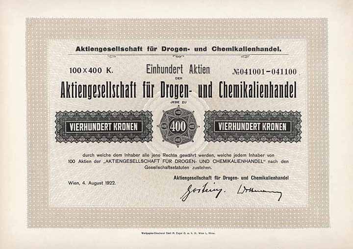 Info:Engros- und Detailhandel mit Drogen, Chemikalien, Haushalts- und Waschartikeln. 1925 ging das gesamte Aktienkapital an Eugen Grünsberger über (die Gesellschaft war eine Familien-AG).