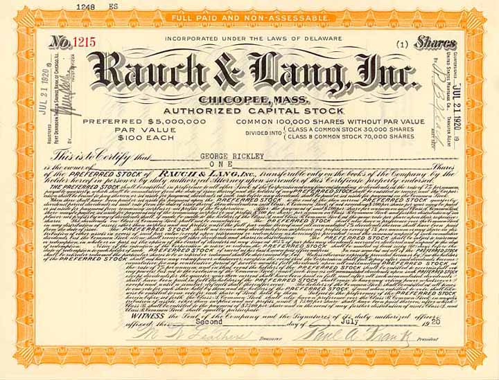 | Vorheriges Los | Zurück | Nächstes Los | | Losnr.: | 1311 (Automobil-Wertpapiere) | | Titel: | Rauch & Lang Inc. | | Auflistung: | 1 pref. share à 100 $ 2.7.1920. | | Ausruf: | 80,00 EUR | Ausgabe- datum: | 02.07.1920 | Ausgabe- ort: | Chicopee, Mass. | | Abbildung: |  | | Stücknr.: | 1215 | | Info: | Der deutsche Emigrant Jacob Rauch betrieb in Cleveland, Ohio, seit 1853 eine Wagenschmiede und tat sich 1884 mit Charles E.J. Lang zusammen, um den Kutschenbau im größerem Stil zu betreiben. Die ersten Rauch & Lang Elektromobile kamen 1905 auf den Markt, exzellent verarbeitet und von auffallender Eleganz. Gründung der AG 1920. Als das Geschäft mit Elektrowagen zurückging, fusionierte die Firma mit Baker. Ab 1922 wurden die Elektrowagen als Raulang verkauft. Um die Fertigungskapazität auszulasten, baute man auch Fahrzeuge in Fremdauftrag, u.a. für Stevens-Duryea sowie Karosserien. | | Besonder-heiten: | Orange/schwarzer Druck. | | Verfügbar: | Die pref. shares in orange waren bisher unbekannt. Wie auch das folgende Los seit 1988 in der Sammlung. | | Erhaltung: | EF-VF. | | Zuschlag: | offen |