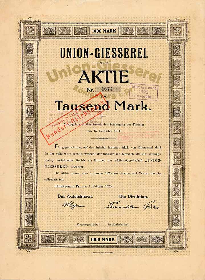 | Vorheriges Los | Zurück | Nächstes Los | | Losnr.: | 731 (Deutschland bis 1945) | | Titel: | Union-Giesserei AG | | Auflistung: | Aktie 1.000 Mark 1.2.1920 (Auflage 5000, R 10). | | Ausruf: | 200,00 EUR | Ausgabe- datum: | 01.02.1920 | Ausgabe- ort: | Königsberg i.Pr. | | Abbildung: |  | | Stücknr.: | 4674 | | Info: | Ursprünglich eine seit 1764 betriebene Silberschmelze, 1826 von dem englischen Gießereifachmann Charles Hughes als Eisengießerei eingerichtet, später auch Kessel- und Maschinenbau. 1877 Umwandlung in eine AG. Ausgeliefert wurde die erste Dampfmaschine 1850, die erste Königsberger Lokomotive "Gilge" 1855, der erste Dampfer "Pregel" 1859. Schon 1899 lieferte das Werk die 1000. Lokomotive ab. Neben Gießerei, Lokomotivbau und Schiffswerft produzierte die Union auch sonstigen Eisenbahnbedarf, Eisenkonstruktionen und eiserne Brücken (insbesondere hydraulische Klappbrücken), stationäre Dampfkessel und Dampfmaschinen sowie Schiffsmaschinen und Schiffskessel. 1907-14 Umsiedlung auf ein neues riesiges, 164 ha großes Werksgelände in Contienen mit 1,5 km Wasserfront am unteren Pregel und an der Beek. 1912 Erwerb der Schiffswerft Gustav Fecher in Königsberg. Börsennotiert in Berlin und Königsberg. In der Weltwirtschaftskrise brach die AG zusammen, 1936 dann endgültig in Konkurs gegangen. So ist es eine besondere Ironie des Schicksals, daß sie dennoch im heutigen Kaliningrad als eines der ganz wenigen verbliebenen Zeugnisse alter Zeit an das früher deutsche Königsberg erinnert: Oberirdisch war Königsberg zwar fast vollständig dem Erdboden gleichgemacht, doch die Straßengrundrisse (man findet sich mit historischen Stadtplänen noch heute problemlos zurecht) blieben erhalten, wie auch die Kanalisation: So stößt man bei einem Stadtrundgang noch heute andauernd auf Gullideckel mit der Umschrift “Union Giesserei - Contienen”. | | Verfügbar: | Aus alter Sammlung. (R 10) | | Erhaltung: | EF-VF. | | Zuschlag: | 200,00 EUR |